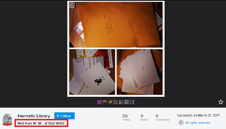So after a little bit of research into oldwvlf lead me to a Bulletin Board System (BBS) website run by a group or organization called The Hermetic Library, and to a profile page by Matthew Charles Moran, with the username OLD WVLF.