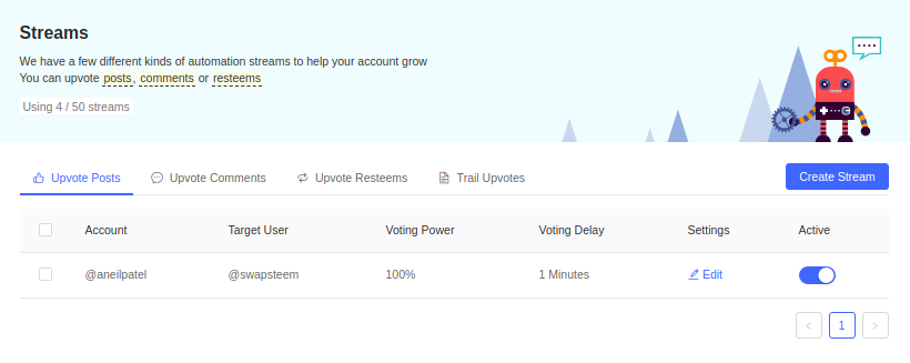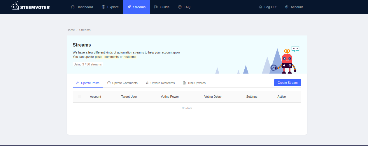 Step 4 : To enable auto upvotes, Create a new stream via in the streams section.