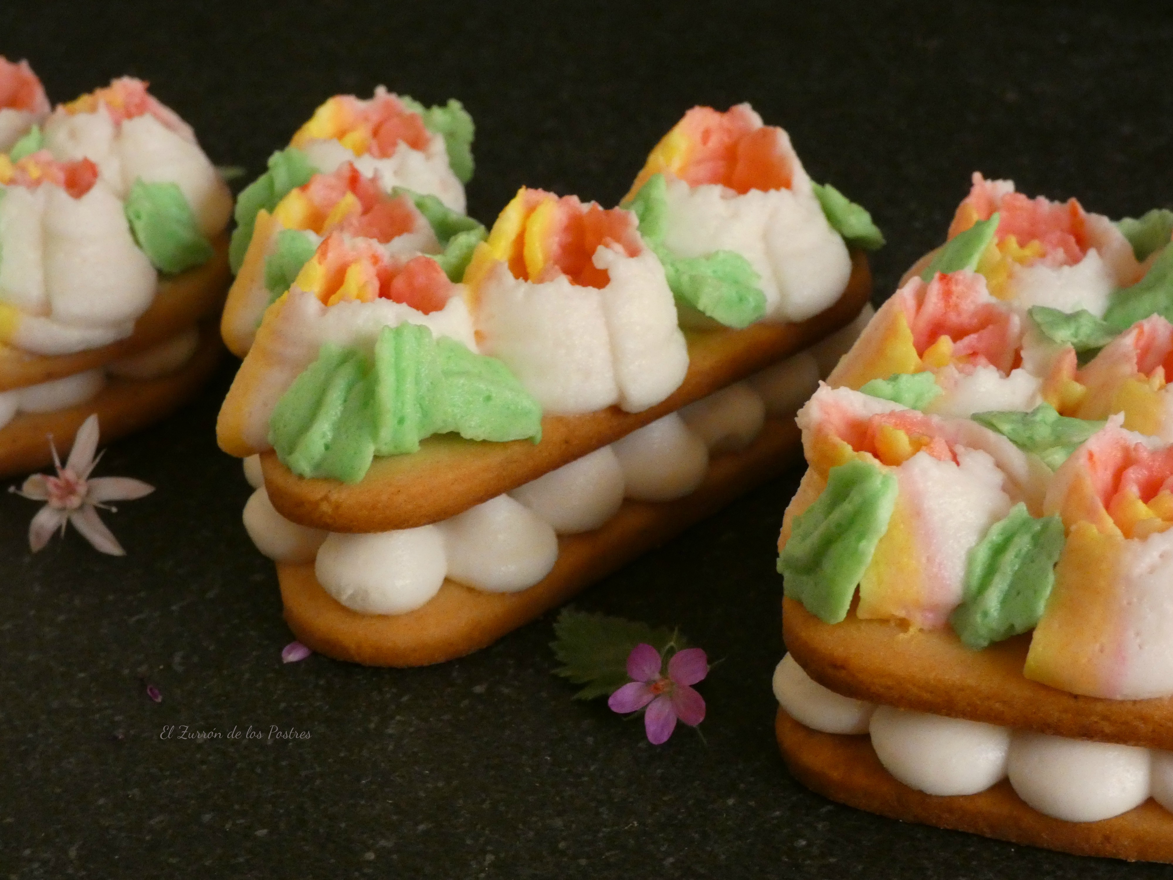 Once they are cold, we decorate them with whipped cream to our liking with the help of some pastry sleeves and different nozzles. In my case, I decorated the bottom of the cookie with a small smooth nozzle making small piles. On top of the cookie with Russian flowers and leaves.