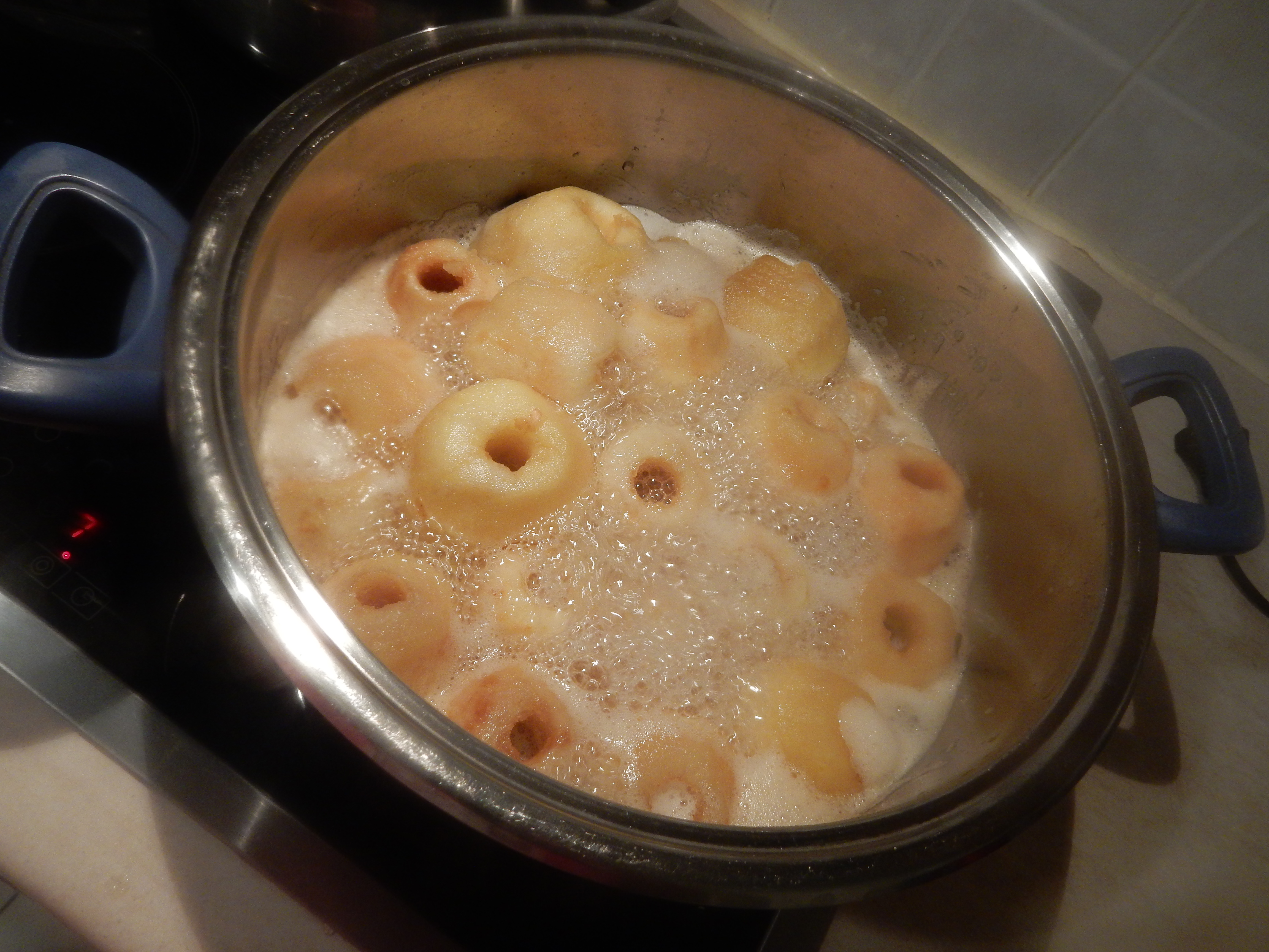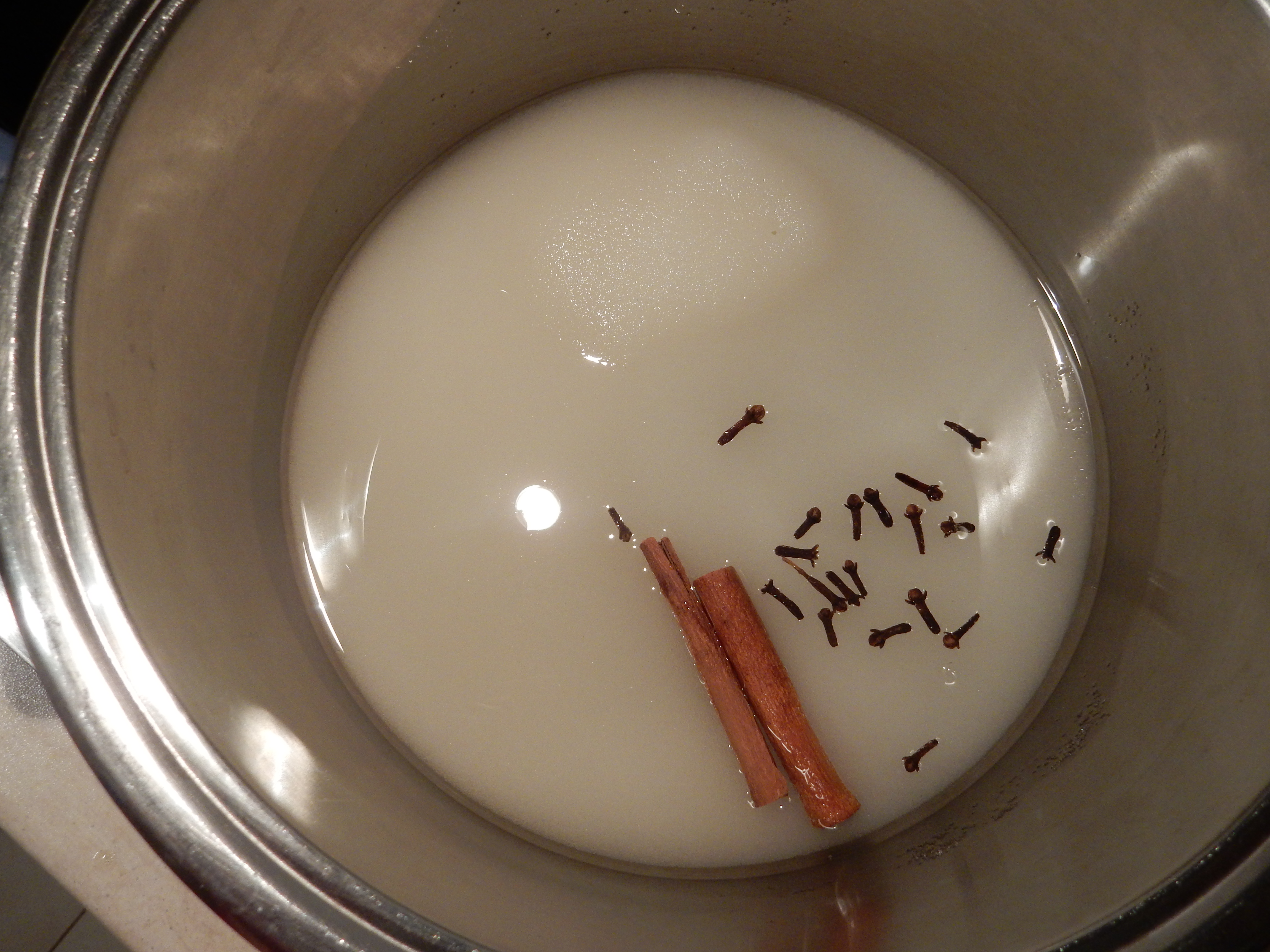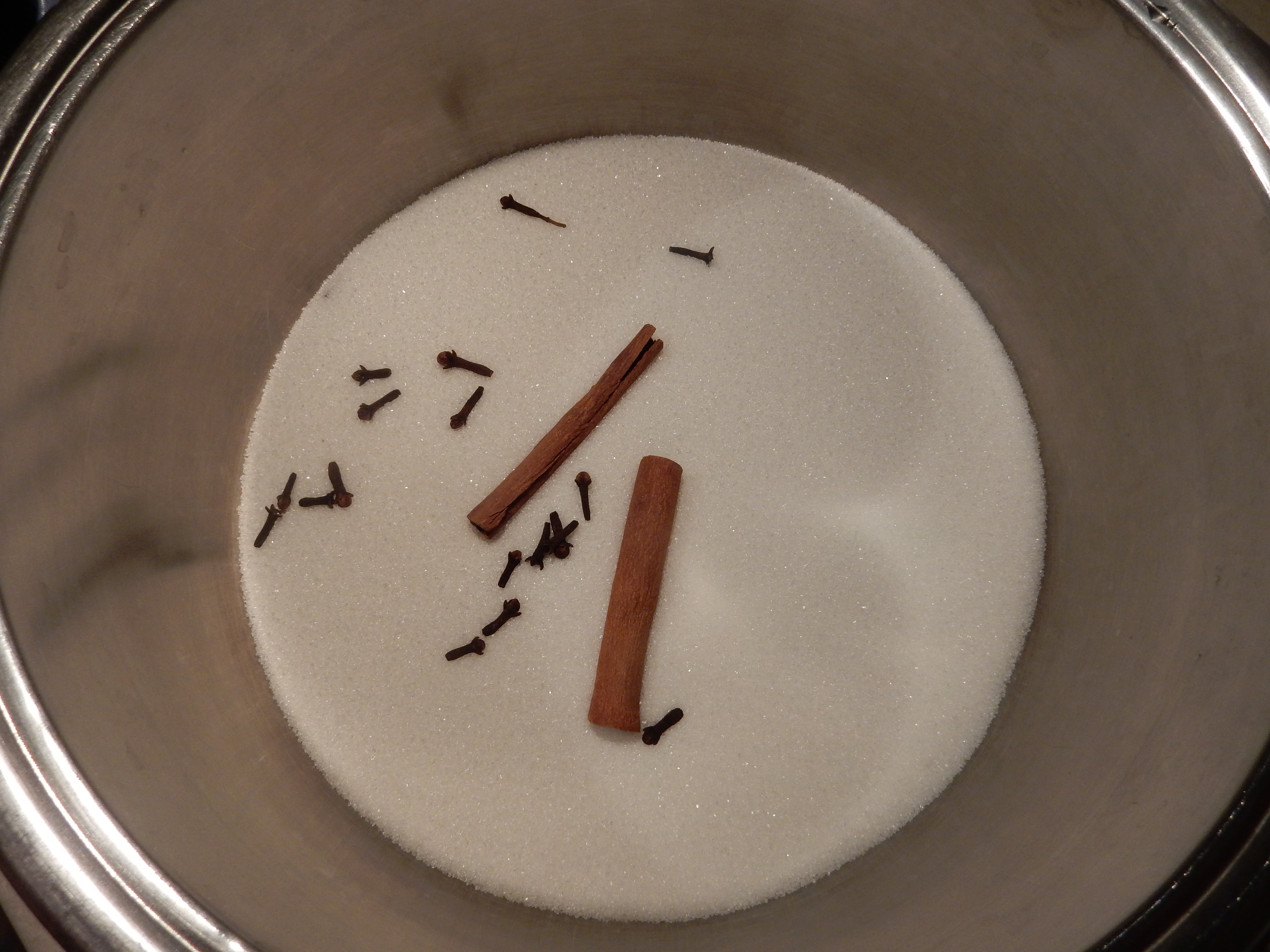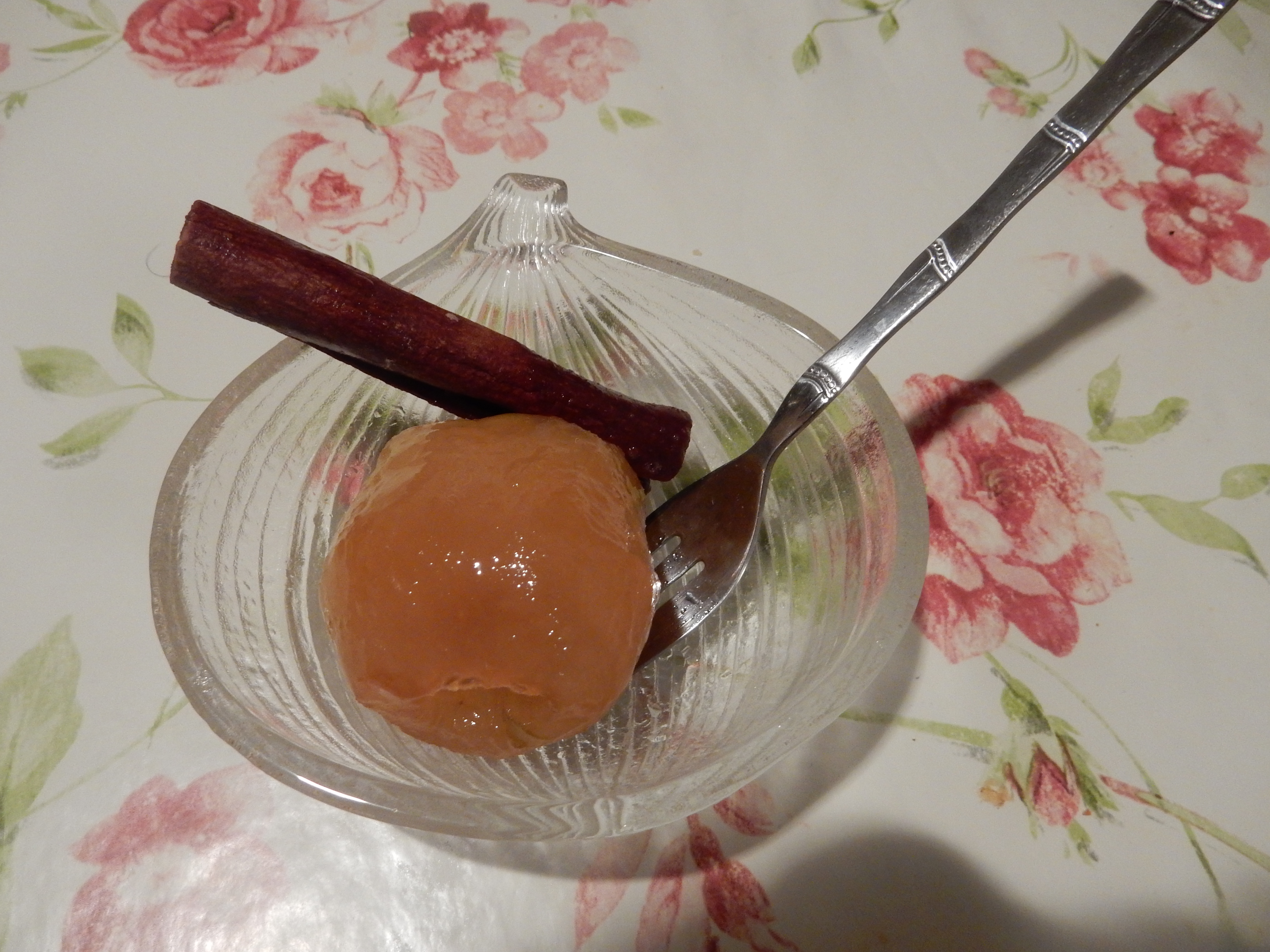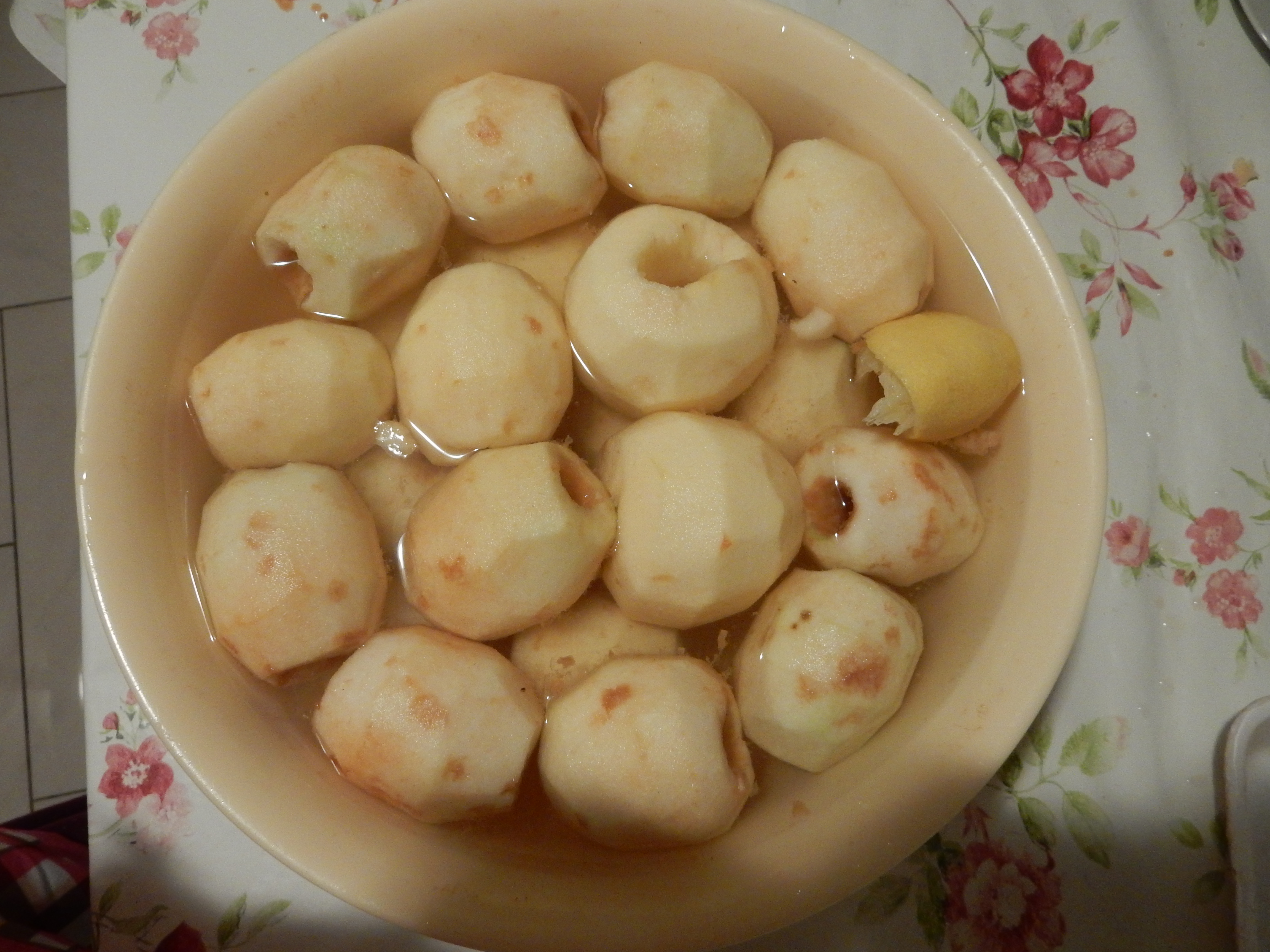 We peel off the apples. We put them in a bowl with lemon juice from a half lemon. We put a pot on fire with the sugar cinnamon cloves and the water. When the sugar has melted we put the apples and we low the fire to the middle. We boil them for half an hour. Then we put white almonds to every apple and it's ready to be served.