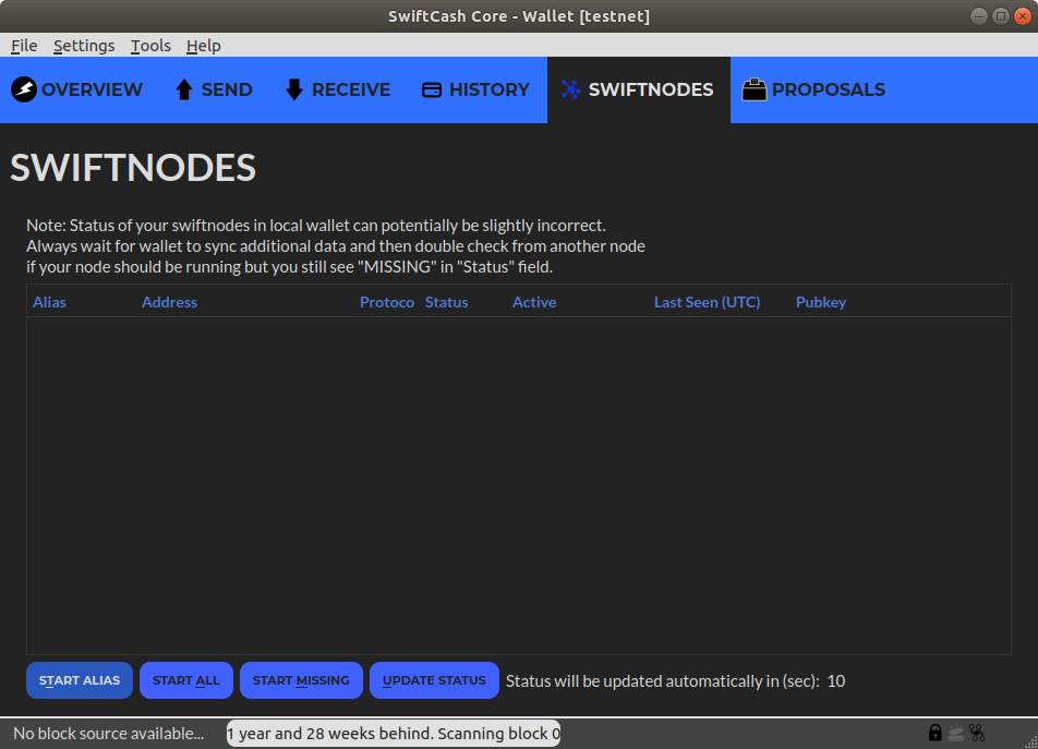 Then the server will ask you to enter the genkey. This key must be exactly the same genkey you have generated previously and added to swiftnode.conf. Once you enter the genkey, press Enter and our swiftnode installer should do all the heavy lifting for you on the server. Once it's over, you should see something like swiftcash server started on the server. You can now close the terminal or puTTY and then go back to your local wallet to start the node. Click on SwiftNodes tab and then after selecting your node, click on Start alias or Start MISSING. Your SwiftNode's status should change to PRE_ENABLED. It roughly takes about half an hour for a swiftnode to become ENABLED after this. That's it! You're all set and ready afterwards! You can close your local wallet after your SwiftNode's status changes to ENABLED.