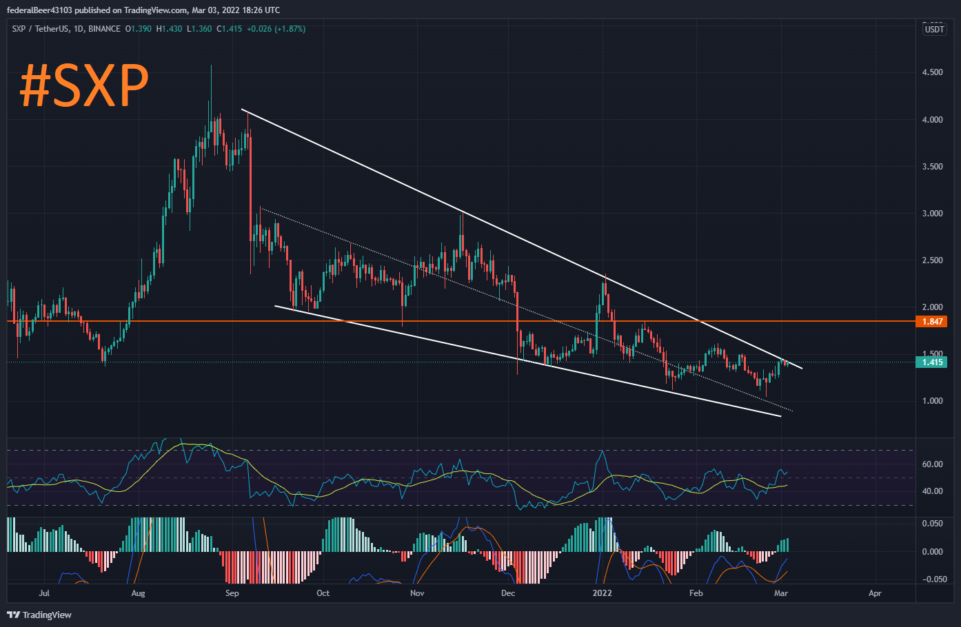 SXP is forming a falling wedge pattern that it is trying to break out of at the current moment. The market strength is there for us to break this wall, but I would like to wait for a possible pullback to the resistance wall and confirmation in support.
