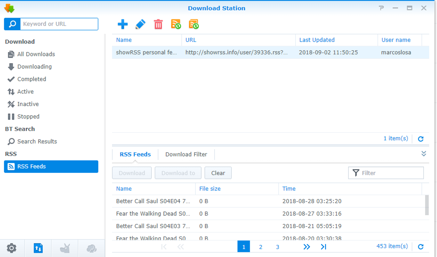 Go to ¨Download Station¨ in the Synology and paste your person feed in ¨RSS Feeds¨