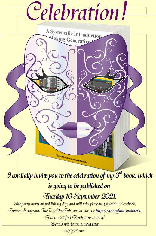 My 3rd Book! Party Invitationrofilm (57)in #synthesizer • 5 years ago Be invited to my 24/7 party starting September 10, 2021. Take down a note in your diary! There will be fun, entertainment and rewards to get. Details are going to be announced later. Enjoy your day! Rolf Kasten #modularsynthesizer #music #sound #synthpatches