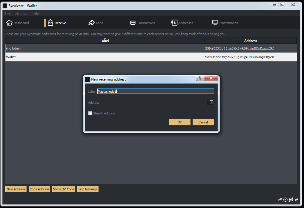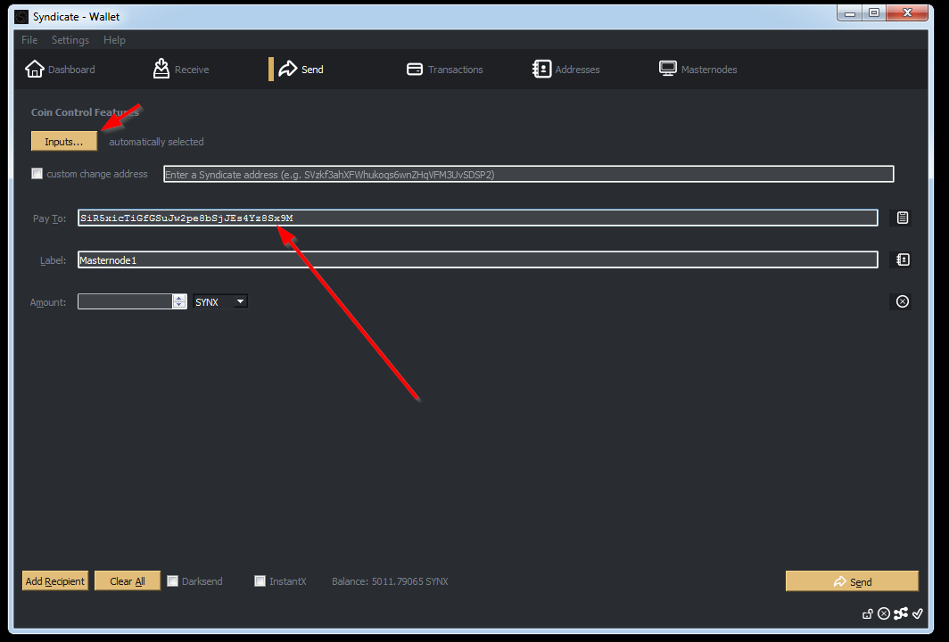 Now you can create new Masternode address where you will need to send exactly 5000 SYNX