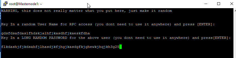 add 2 lines rpcuser and rpcpassword. Both must be different and cannot include special characters. Make a note of it for later use.