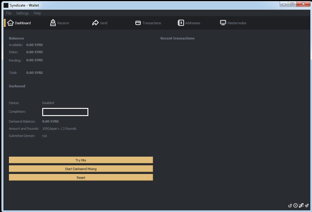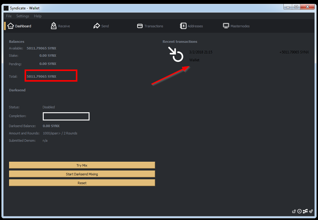 Start your wallet again using syndicate-qt and wait for sync to finish. When its finished it should look like this: