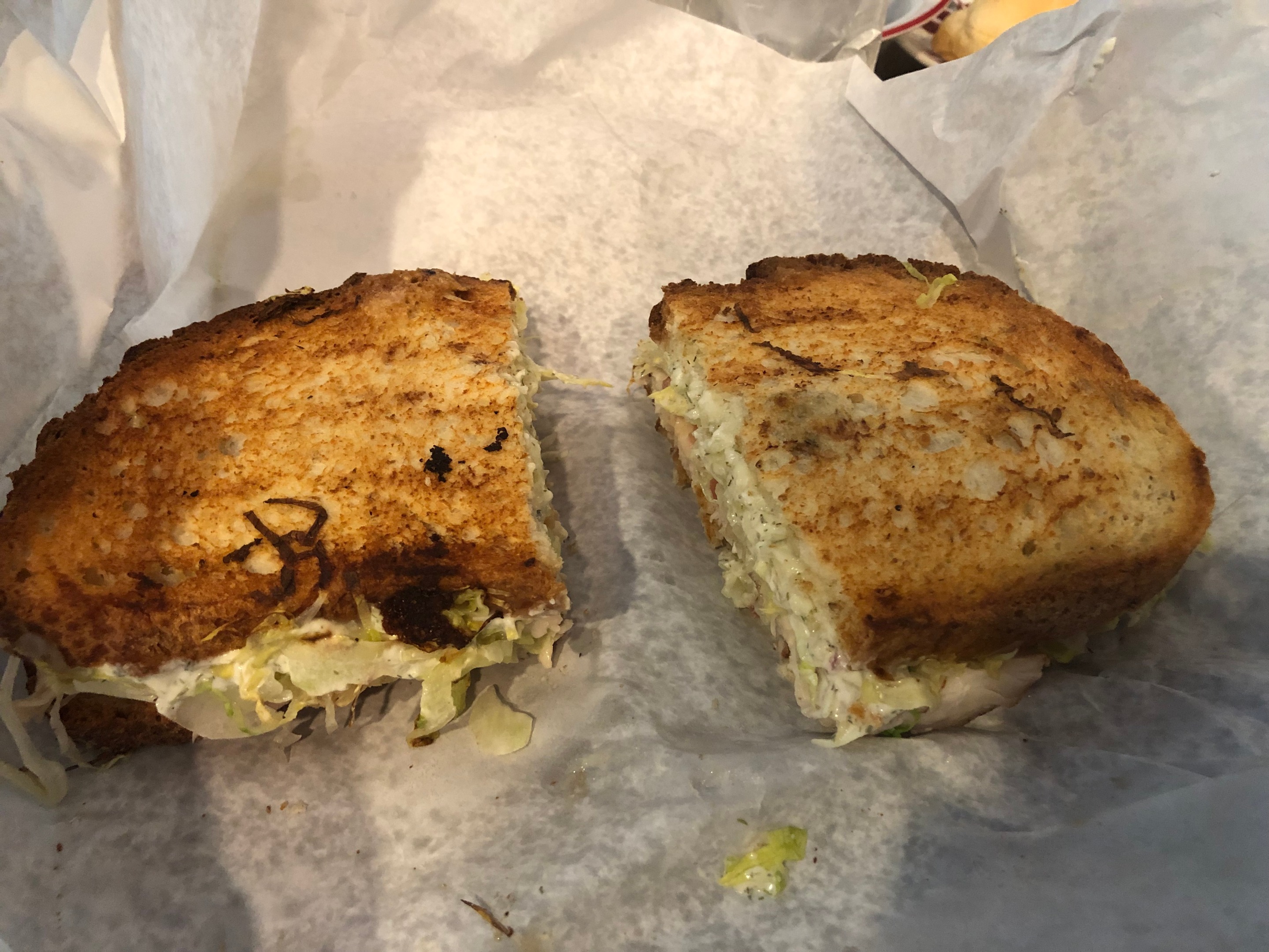 I ordered a Turkey, Bacon, Cheddar grilled panini to go along with my Mussel Chowder. It was my first time trying a sandwich from Bobette's (I usually just get soups). There was something about it that seemed off. It was served with a housemade dill sauce, lettuce and tomato. The toasted bread had a burnt flavor to it, not sure if it was the bread's fault of the griddle's fault, but I didn't really like it. From now on I will stick to the soups.