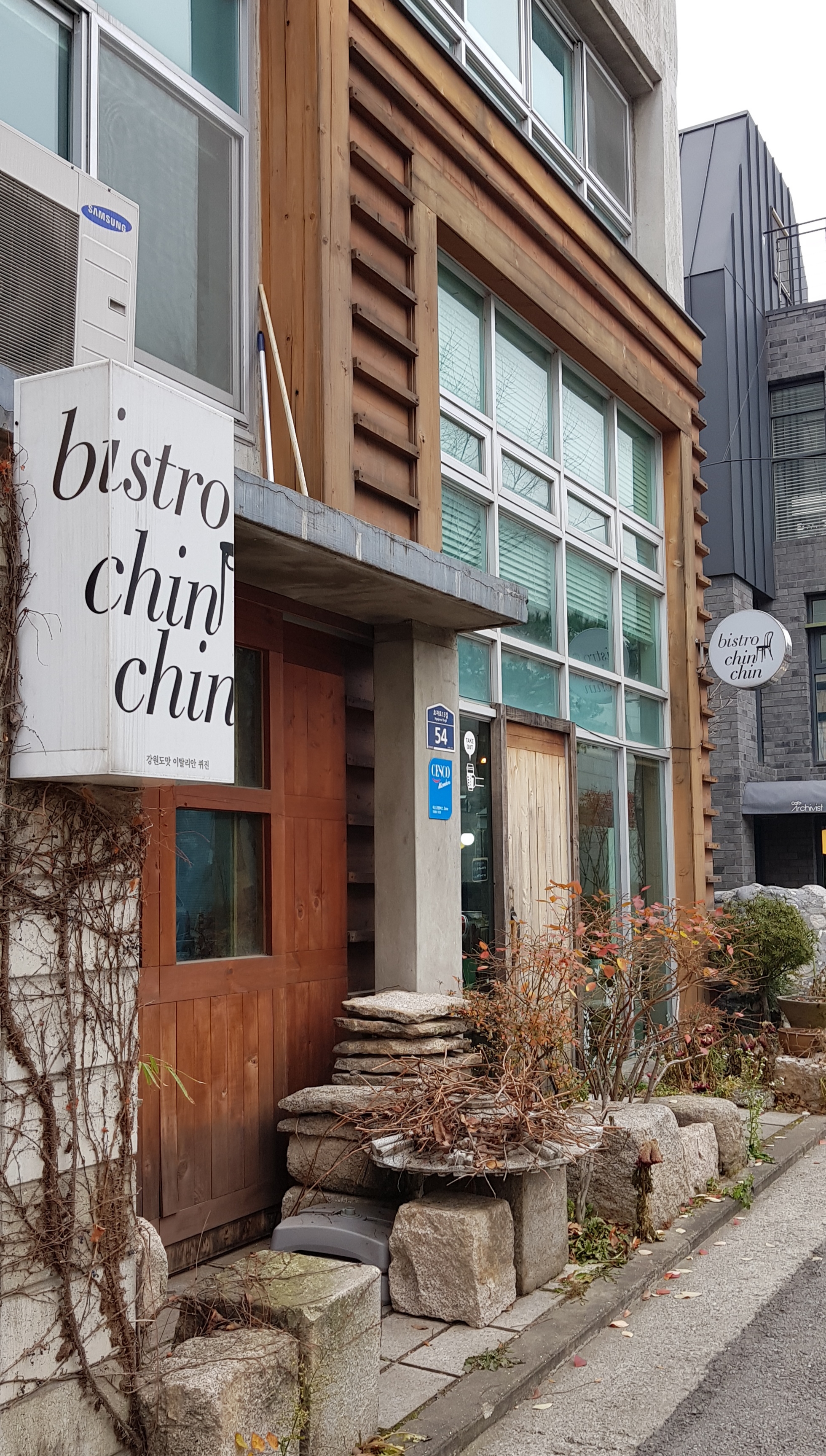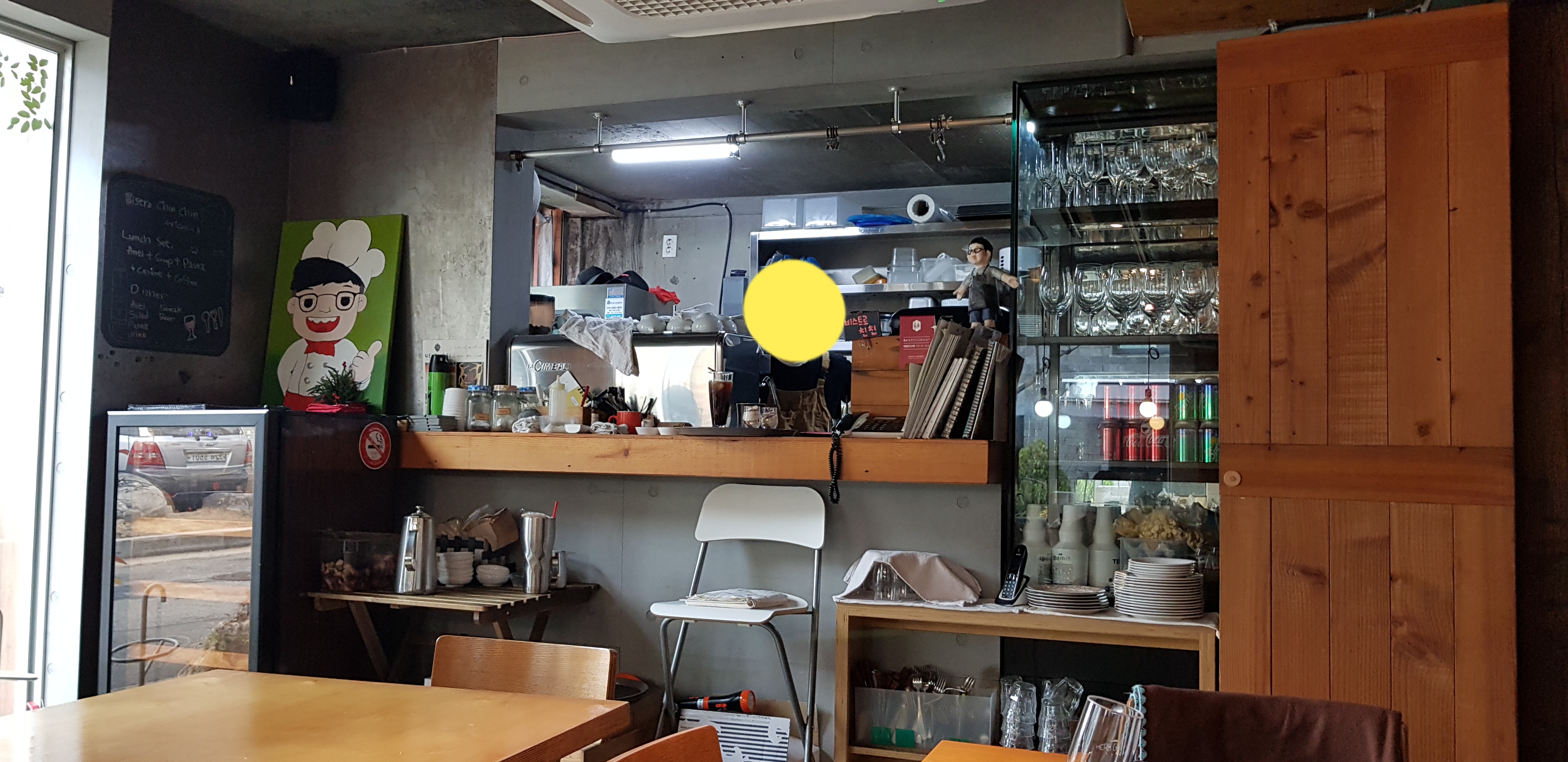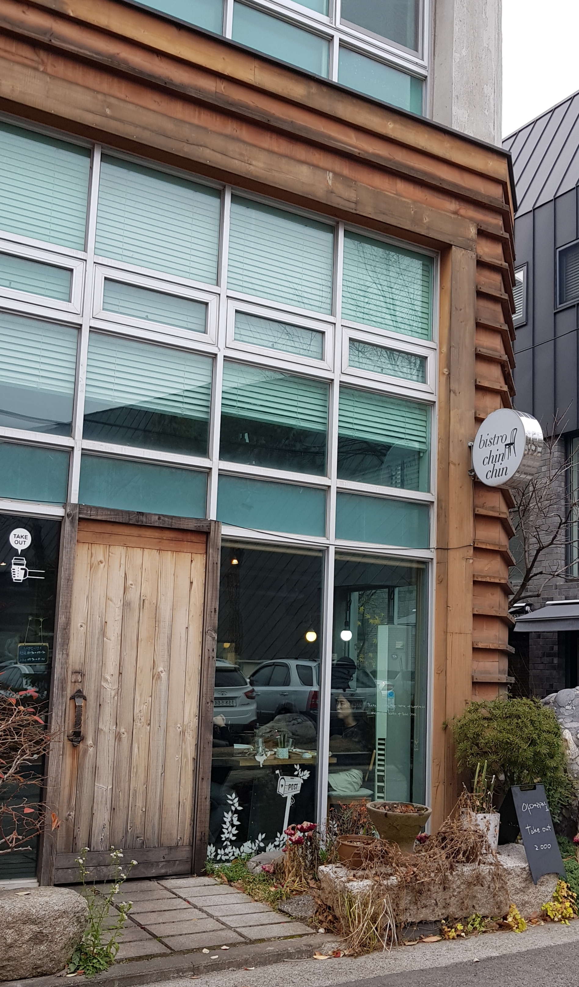 온통 유리창에 목재문이 이질감을 주는 야릇한 분위기입니다