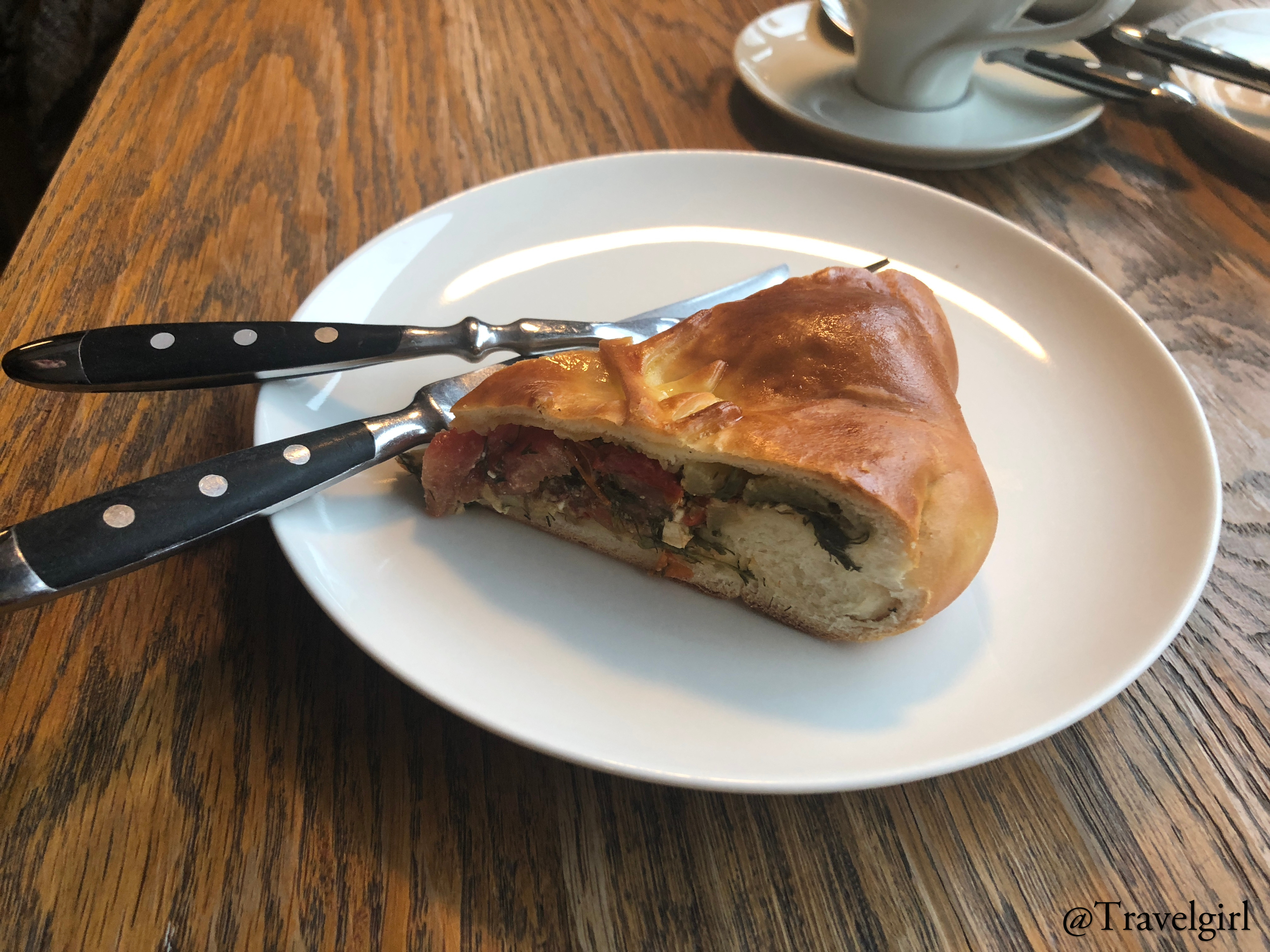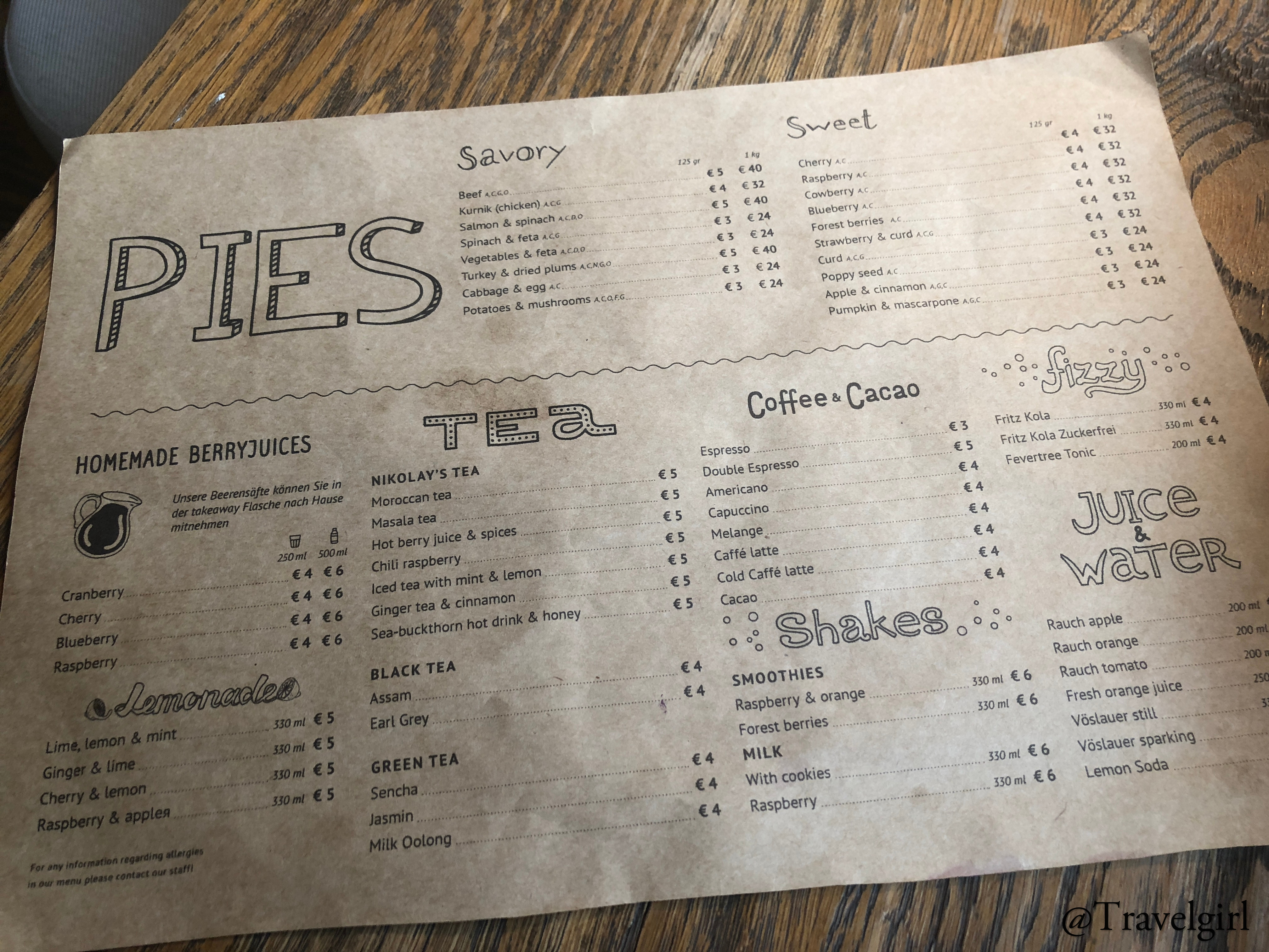 There were all sorts of yummy food but we had our eyes set on their handmade pies. They call them pies but in Australia we may call them as quiche as the filling is just like a quiche just the top part looks like bread. It was the perfect type of food to eat in winter. So we both ordered a slice of pie each (one vegetarian, one chicken, a coffee, a pot of tea and an orange juice.