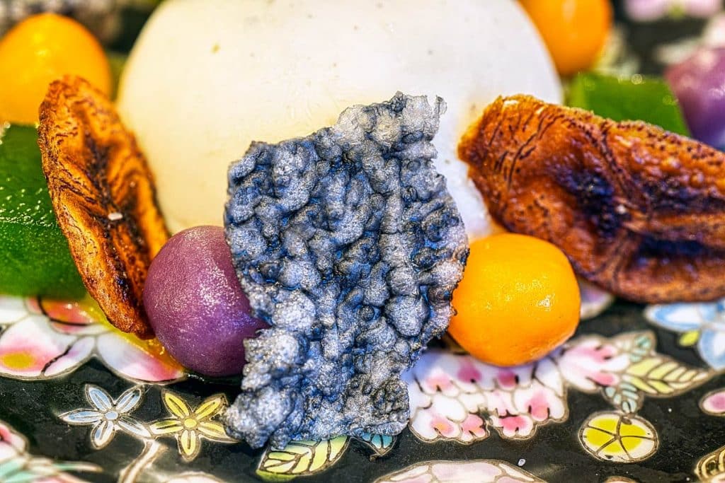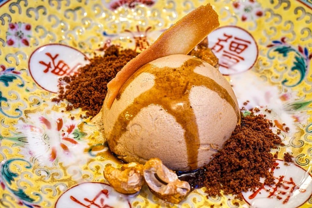 In order to keep things local, our second dessert was a deconstructed Nyonya Classic, the Pengat: homemade coconut ice cream paired with jackfruit puree, Pandan gelee, sweet potato dumpling and banana chips. After all, the fruity puree surprised me, as for a minute I thought that it was made of mango. It was a perfect synergy of gentle coconut and intense jackfruit, with the mix of chewy potato dumplings and crunchy banana chips.