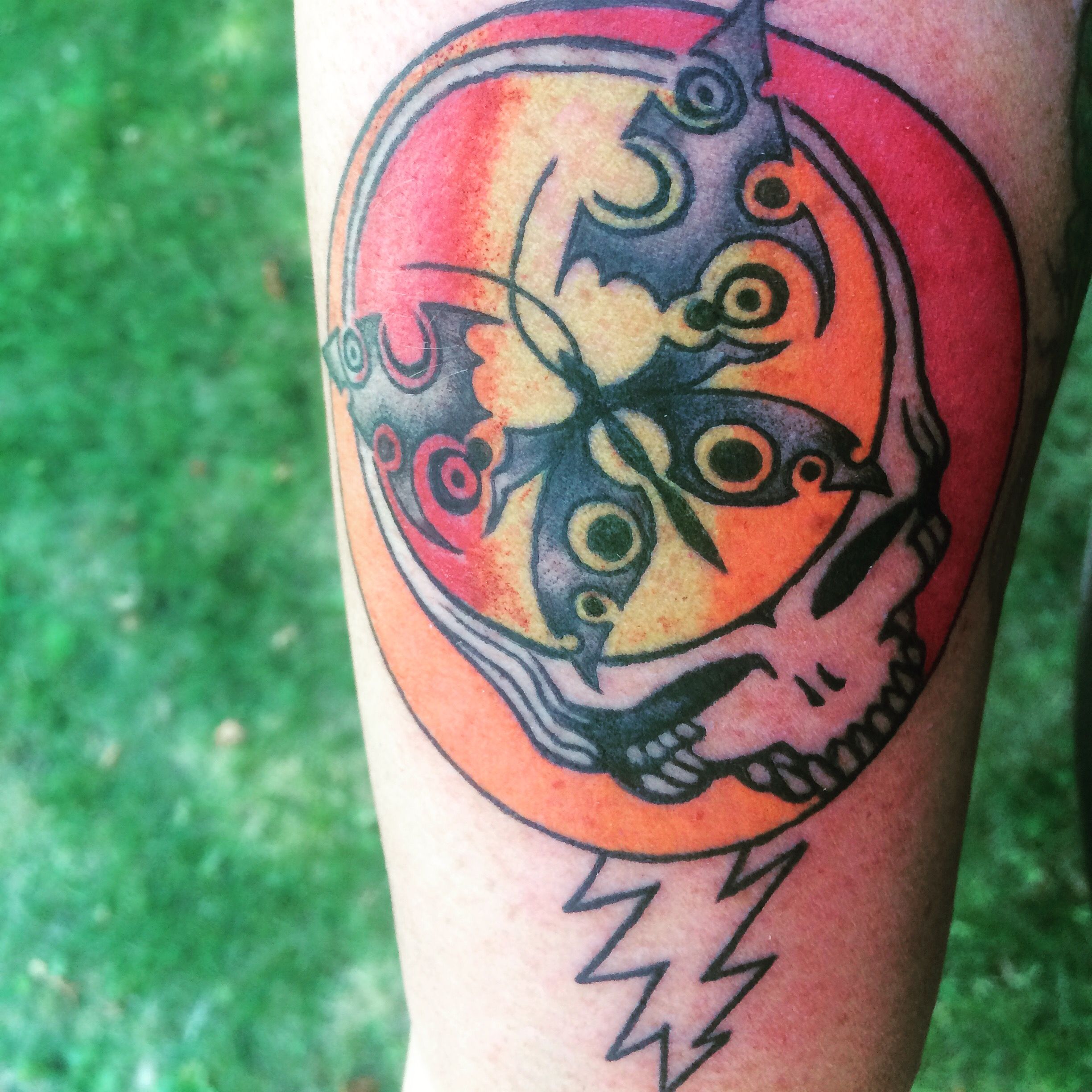 The above tattoo is my hippy drippy steal your face tattoo with a tribal butterfly. It is a fun reminder of my younger days!!