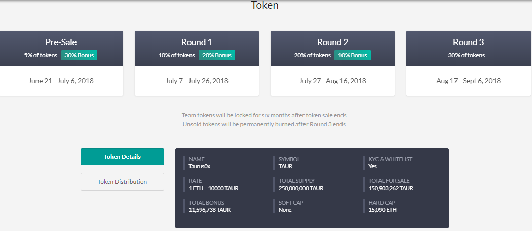 Token miktarı 250 milyon adet token arzının 151 milyon adeti satışa sunulmuş durumda, Token fiyatı 1 ETH 10000 TAUR olarak belirlenmiş. Genelde bir softcap yani ulaşılması gereken minimum yatırım miktarı hedeflenir fakat Taurus0x ekibi bunu uygun bulmamış ve direkt Hardcap miktarı belirlemişler ve 15000 ETH civarı bir miktar öngörülmüş. 6 eylüle kadar hala devam etmekte olan proje uygun bir yatırım fırsatı olarak görülebilir.