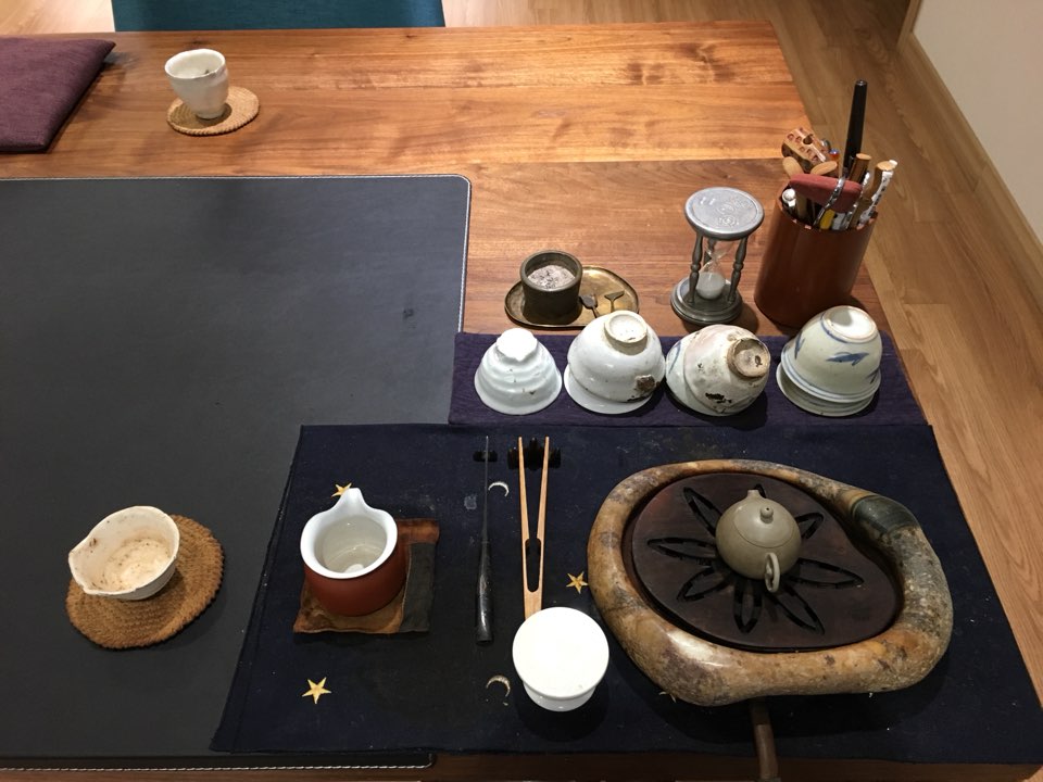 그런 과정에 환자와 대면하는 자리에서 작은 다기로 차 한잔 대접하고자 별도로 준비하였다. 그런 자리에 딱 어울리는게 대만의 기고당 제품의 다기이며 차를 기고당 사장님이 주장하시는 1인 분량이 좋은 차 1g을 넣어서 사용했다. 실제로 원장과의 대담, 문진시에 차 한잔의 효과는 의사 앞의 환자가 조금 안정되는 경험을 여러번 했다고 한다.
