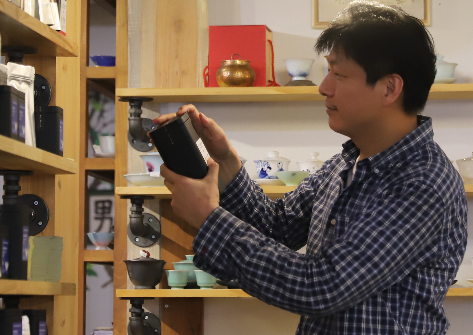 상품 진열대에서 차를 찾는 모습
