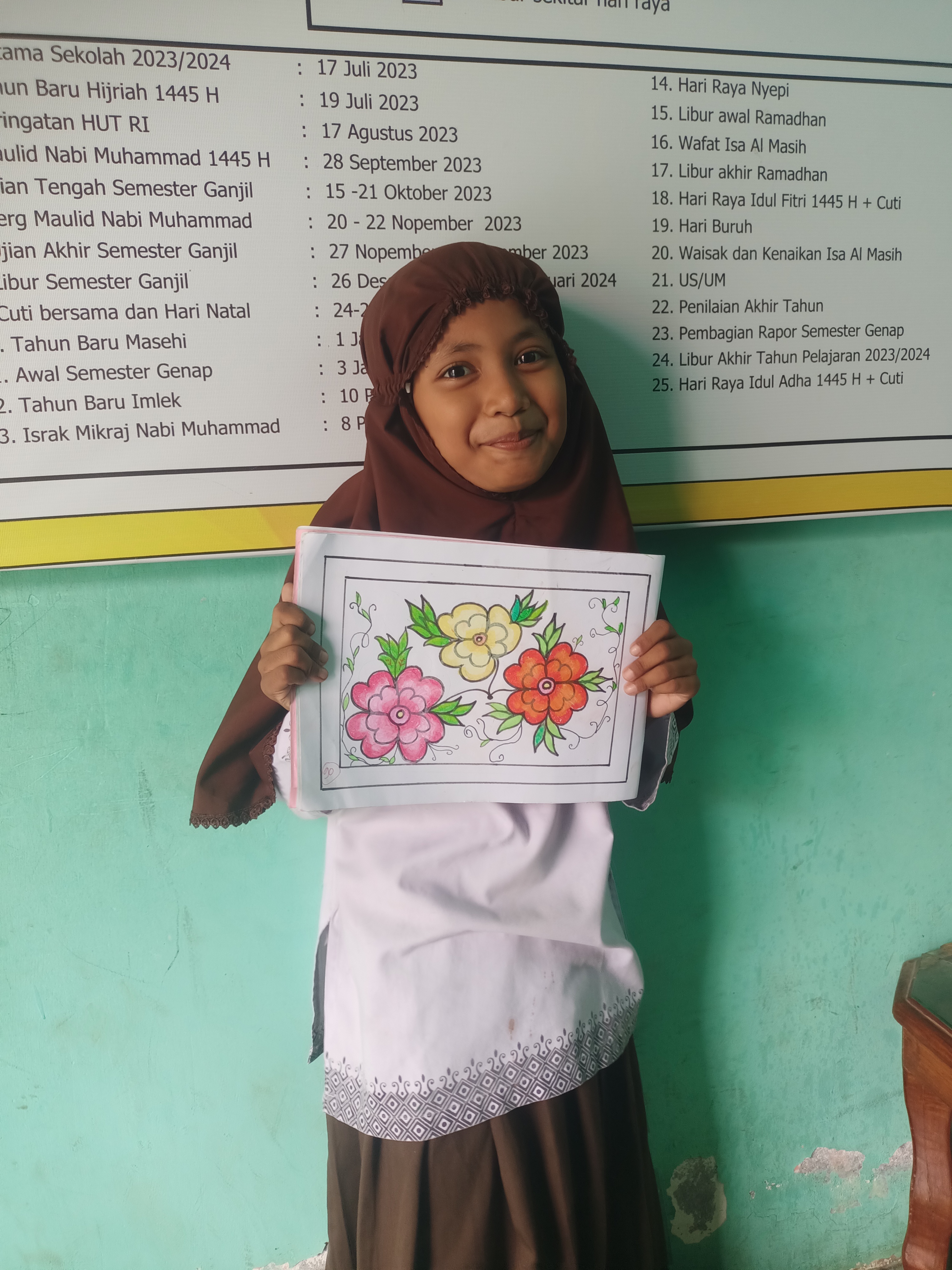 Yang digambarkan oleh putri saya adalah tugas dari sekolah. Guru putri saya memberikan tugas pada pelajaran Seni rupa yaitu menggambar sesuai dengan yang ada dibuku cetak. Dalam memberikan warna pada gambar, putri saya memilih untuk membuat gradasi warna . Kata putri saya membuat gradasi akan membuat gambar kita terlihat lebih indah dan cantik.