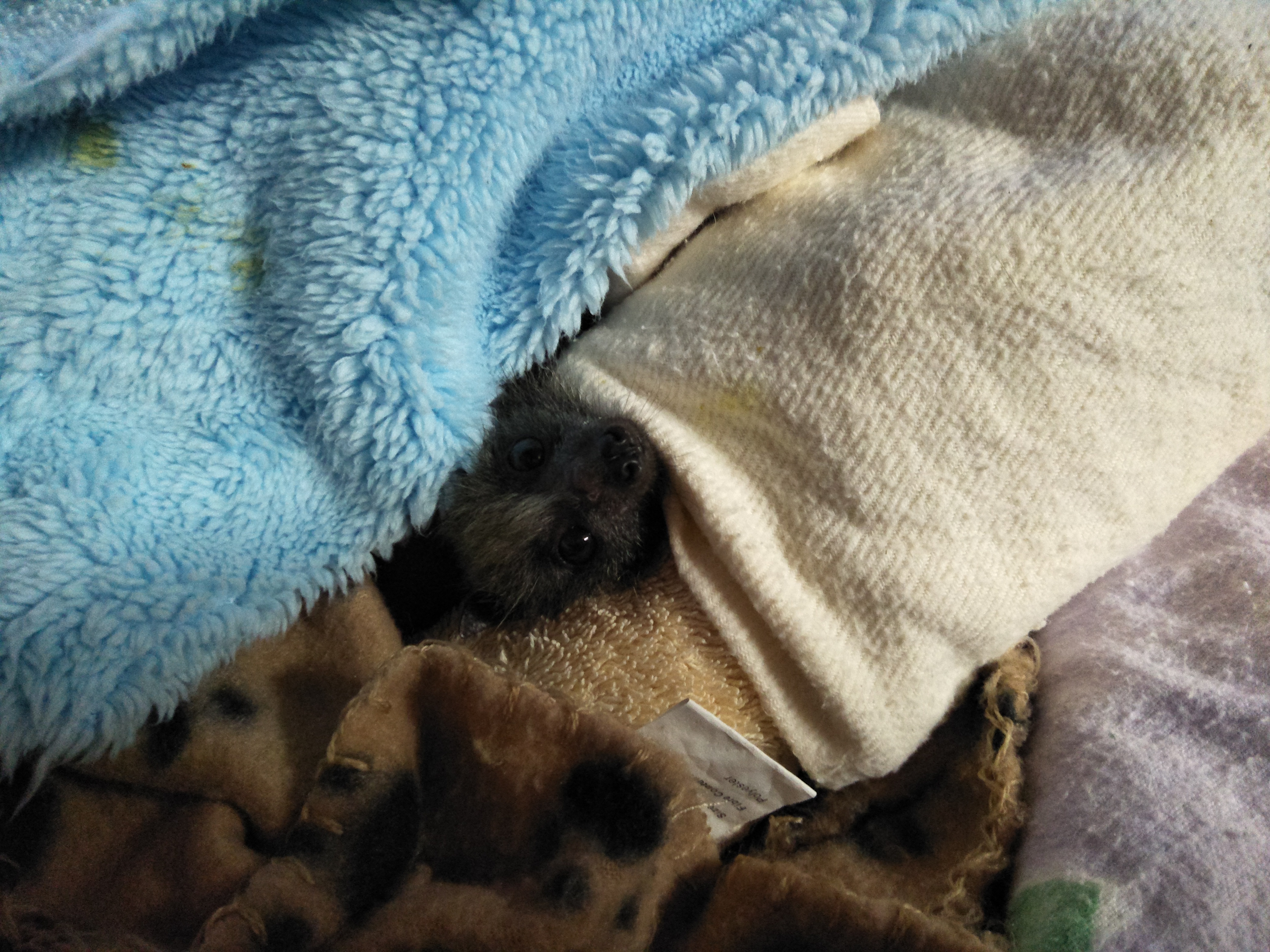 Coco is drinking baby formula milk bottles 5 times a day and will be for the next few months until she is ready to eat fruit and be taken into batty pre school to learn to fly with other orphans they will then be all released back into the wild together on a full moon when the local colony flies over. Until then she will be here with us snuggled up on her mummy roll