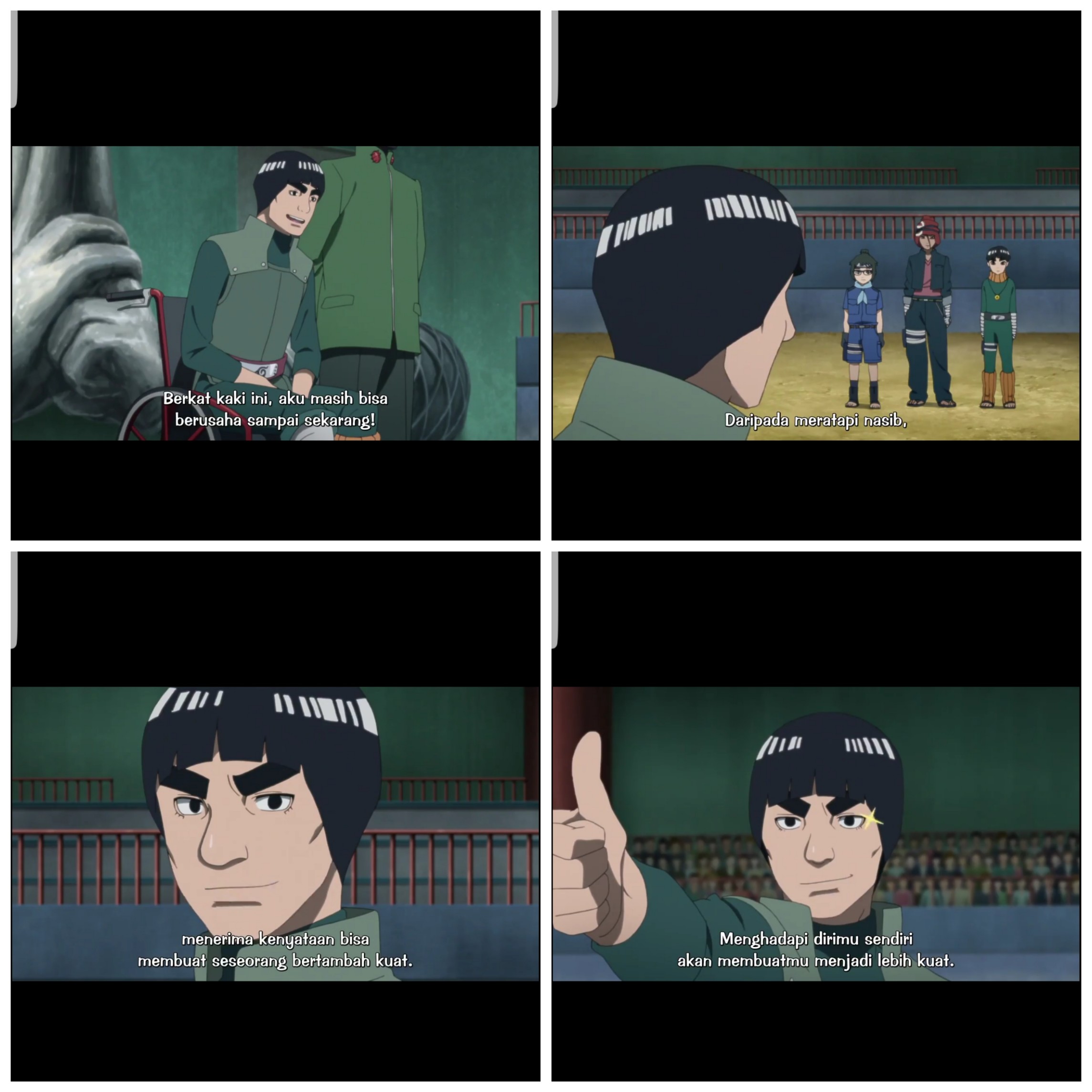 Here is the collage of screenshot images that I have taken from Boruto Episode 70. With the Indonesian subtitles in it. And you guys, this is by far the most touching scene in Boruto. This is where Metal Lee, a young boy who has yet to discover the reality of the world, still learning and shaping his character as a young ninja. In this anime, he was potrayed as a character who has always been struggling with his weakness.