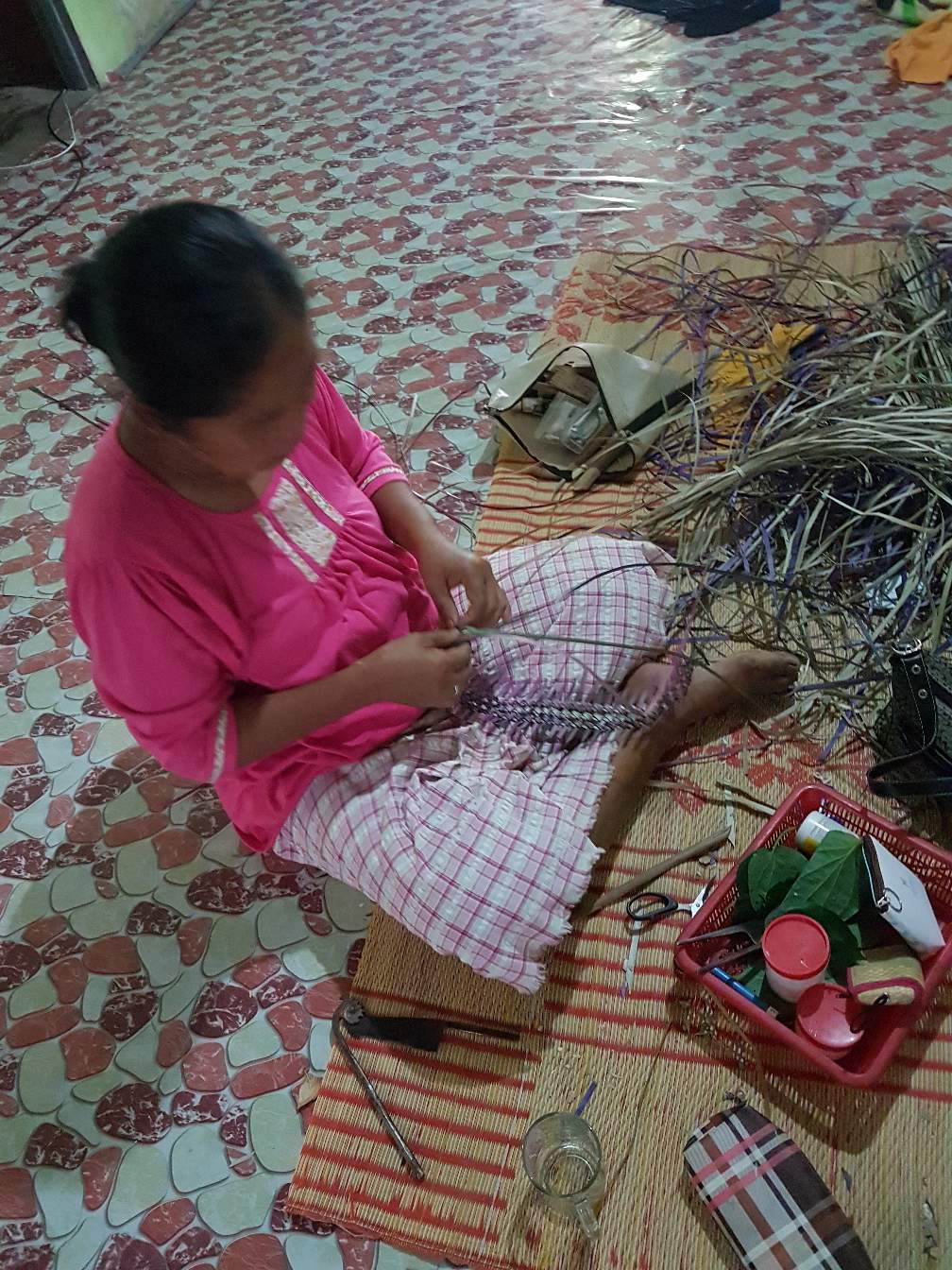 A Jakun lady weaving a headgear for tourists and visitor.
