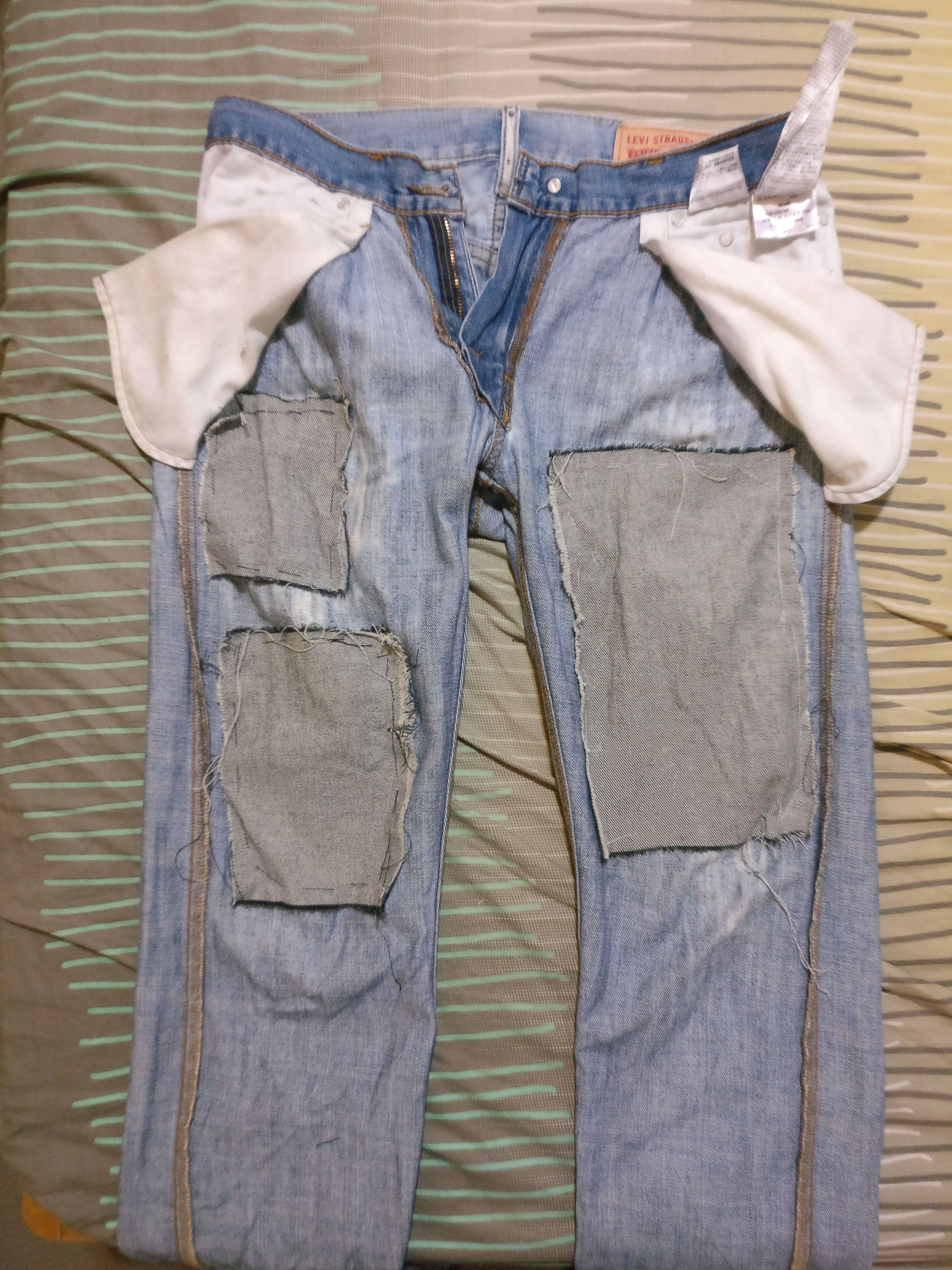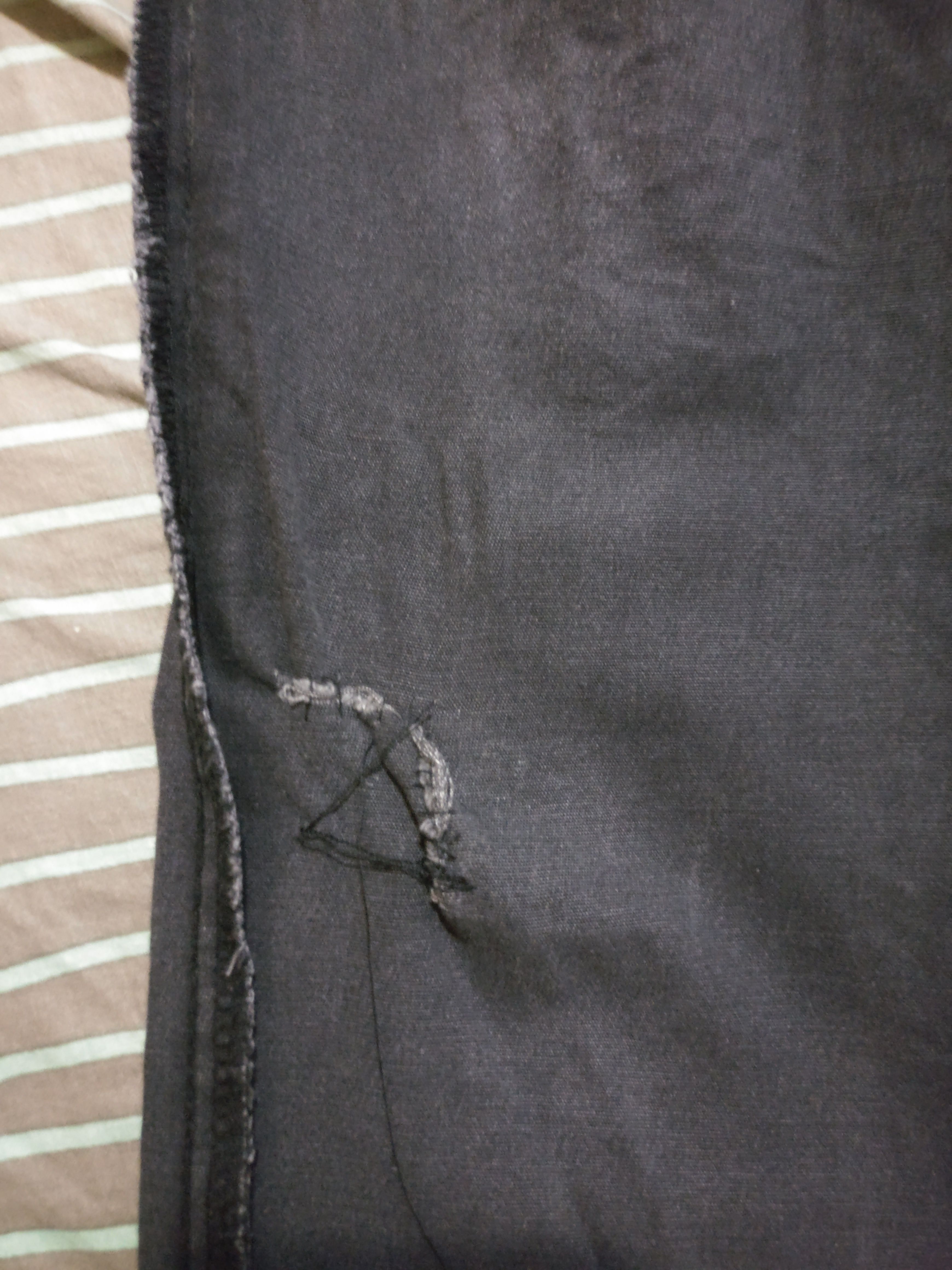 ALWAYS use matching colored threads, or else you will end up a joke of a sewing product like the one I just did. I just created very visible dotted lines on my left thigh. Good job Max. Great! I'd still wear it though hahah! I won't go out like this, I'll just use this as a work jeans.