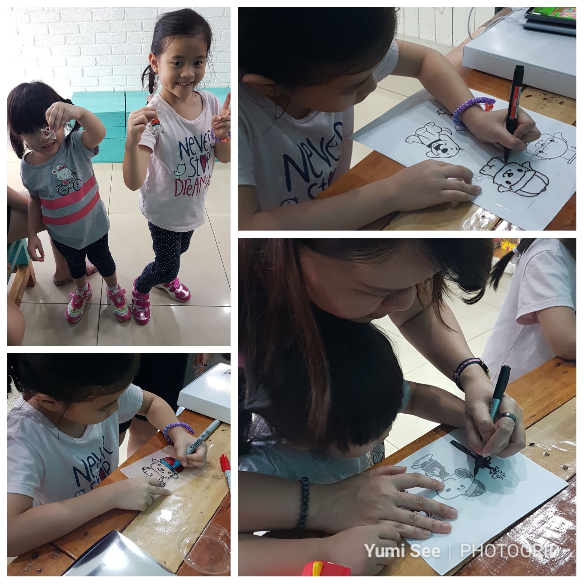最后一个活动缩水艺术与一些狗模版迎接狗年。两位都专心画和彩。Athena年纪还小没办法画就麻烦大姨的帮忙之后放入烘爐烤将做成钥匙圈。