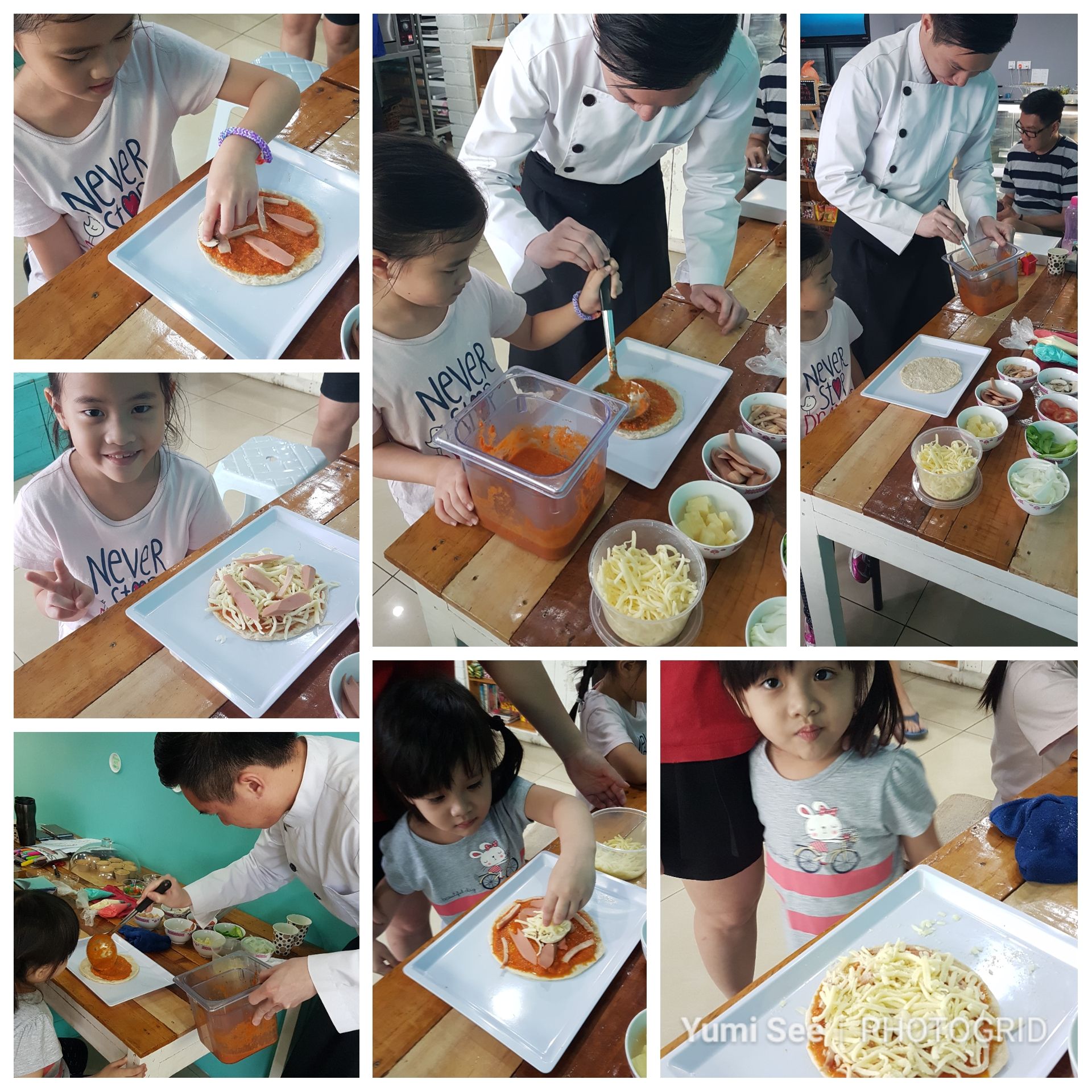 开始第一活动披萨装饰。厨师给大家一人一片披萨皮让大家运用自己的创意力装饰自己的设计。Alyssa装饰了一个人面但最后被起士铺满了之后放进烘爐烤。两位女儿只选择香肠,火腿,蘑菇和起士却一点菜都不行。