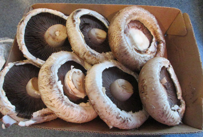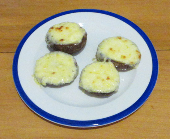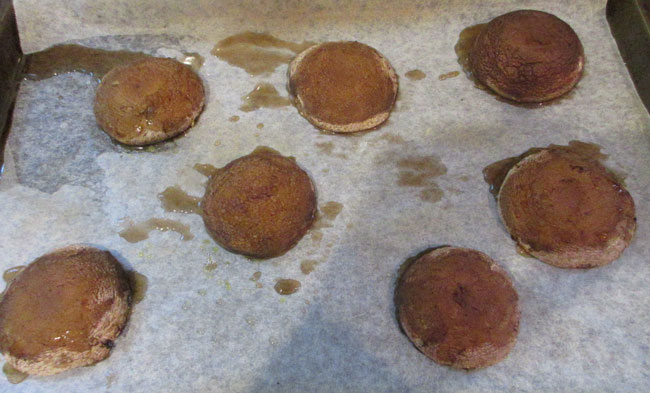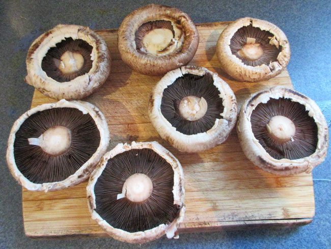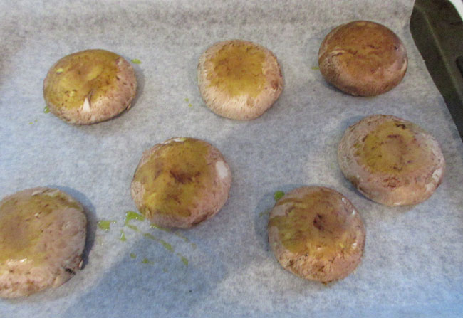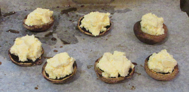 Pop it under the grill, while you prepare the stuffing. The mushrooms are ready to stuff when juices are starting to run off them. Use some kitchen tongs (or a couple of forks) to turn them over and drain off what you can of the excess juices.