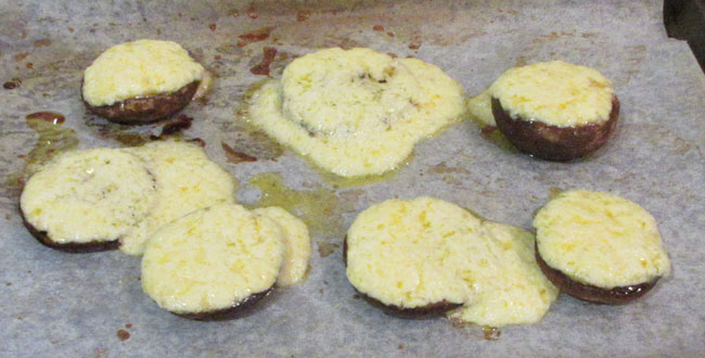 Now you see why it’s so important to have a well enclosed space to stuff! If you’re cooking for yourself, it doesn’t matter too much. Just scrape the overflow off the baking paper and pile it back on top of each mushroom. But for guests, you want them to look nice.