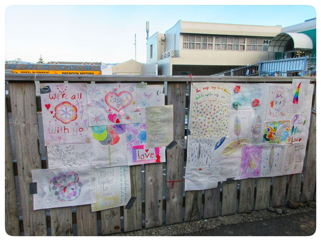 But it really struck me when I went out to teach my arthritis class this morning. The road and footpath are covered with chalked messages of love and support.