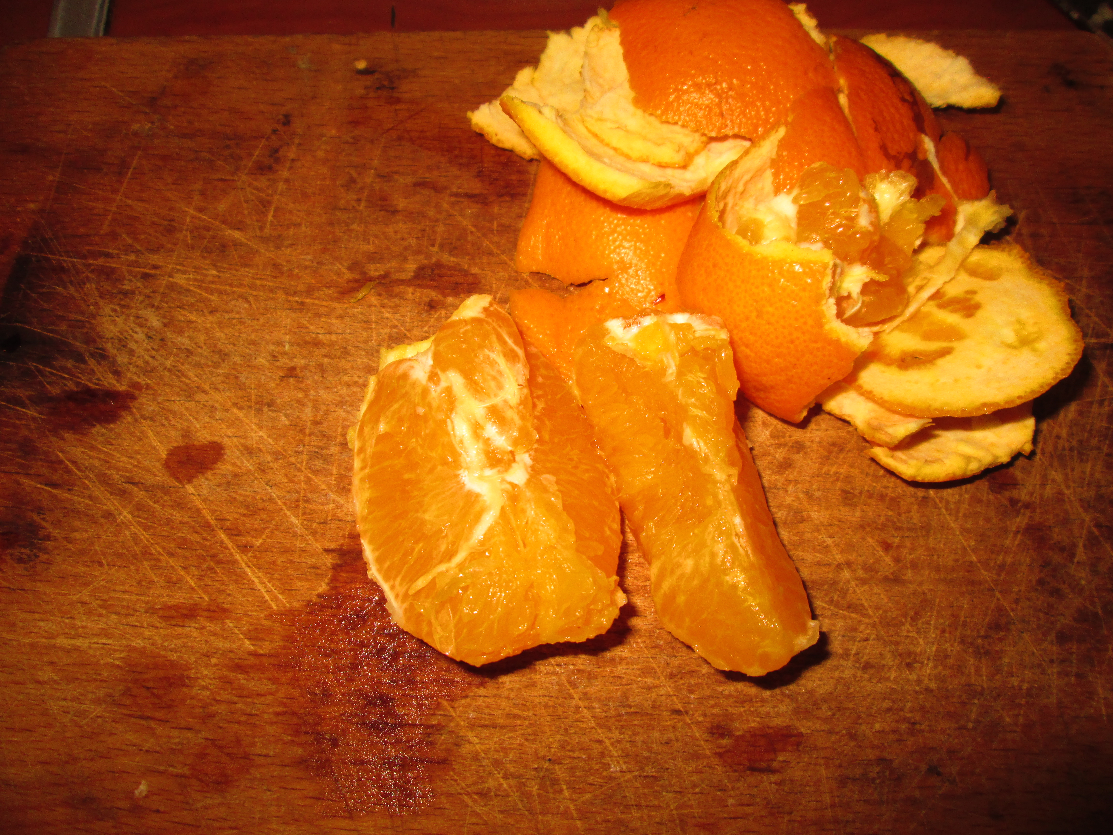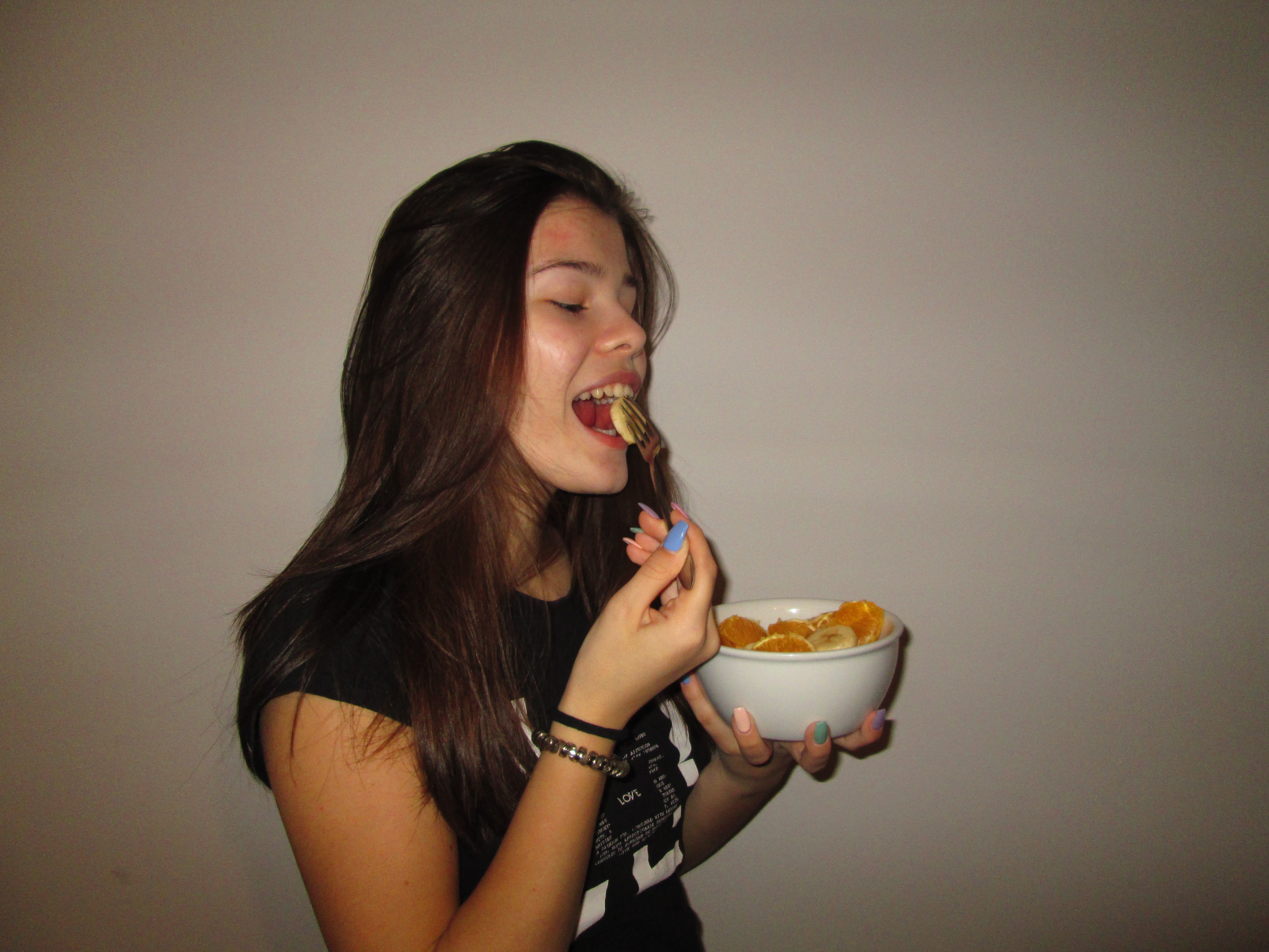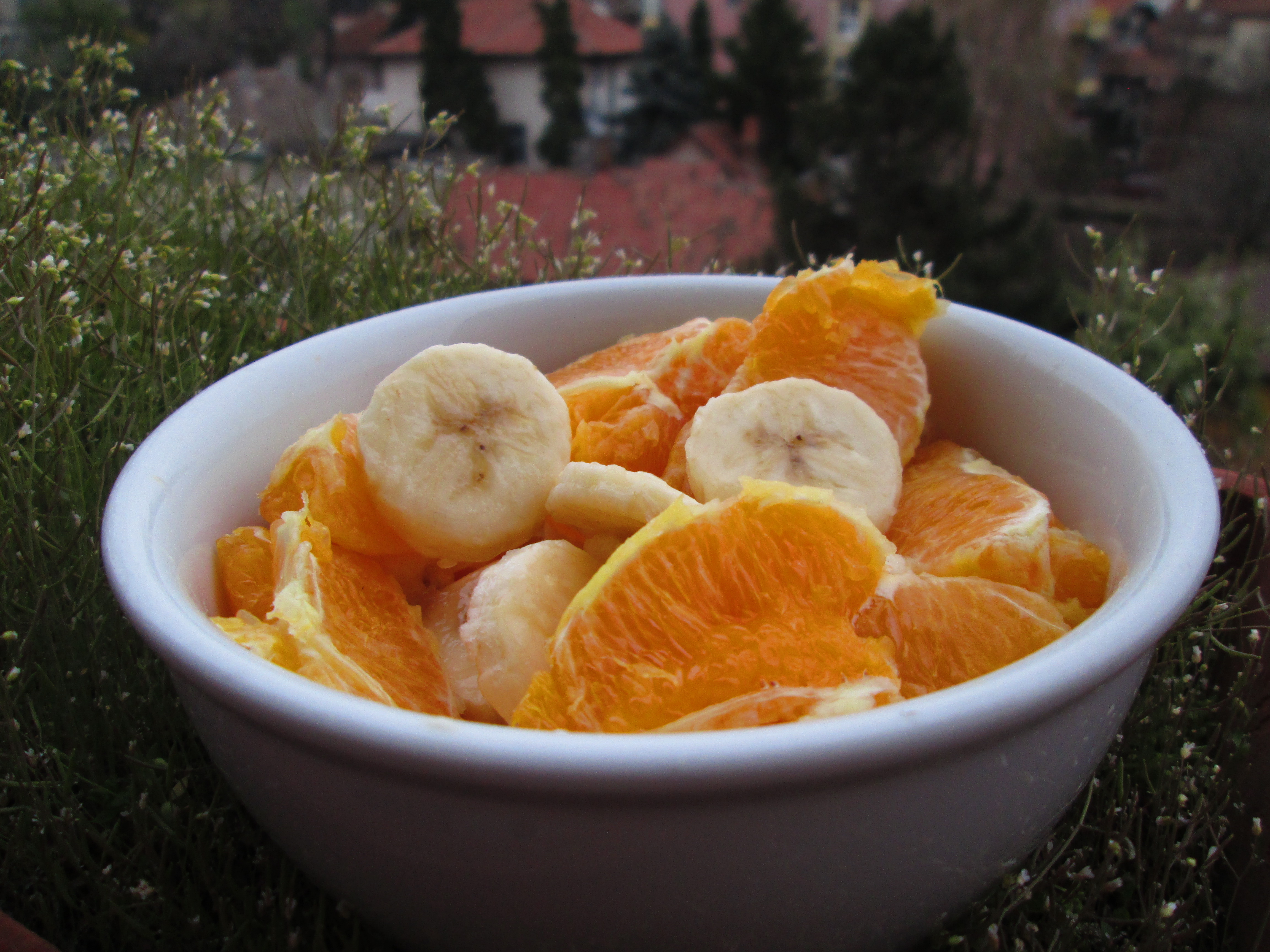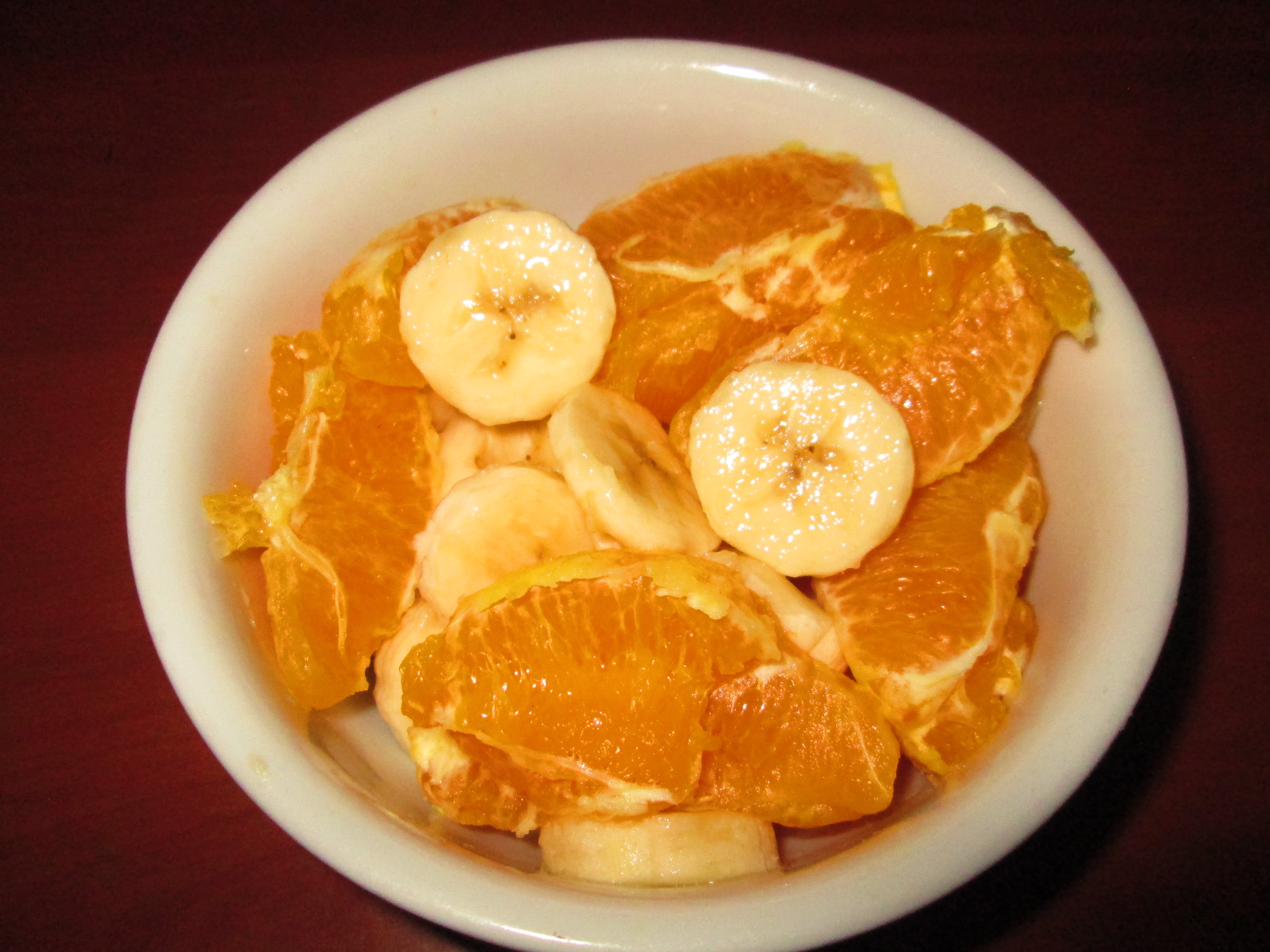 My fruit salad consists of one banana and one orange. I like this combination because oranges are acidic and contain vitamin C and the banana is more sweet and not acidic at all and contains vitamin B6 and C. So those two fruits make a great compromise in my mouth.