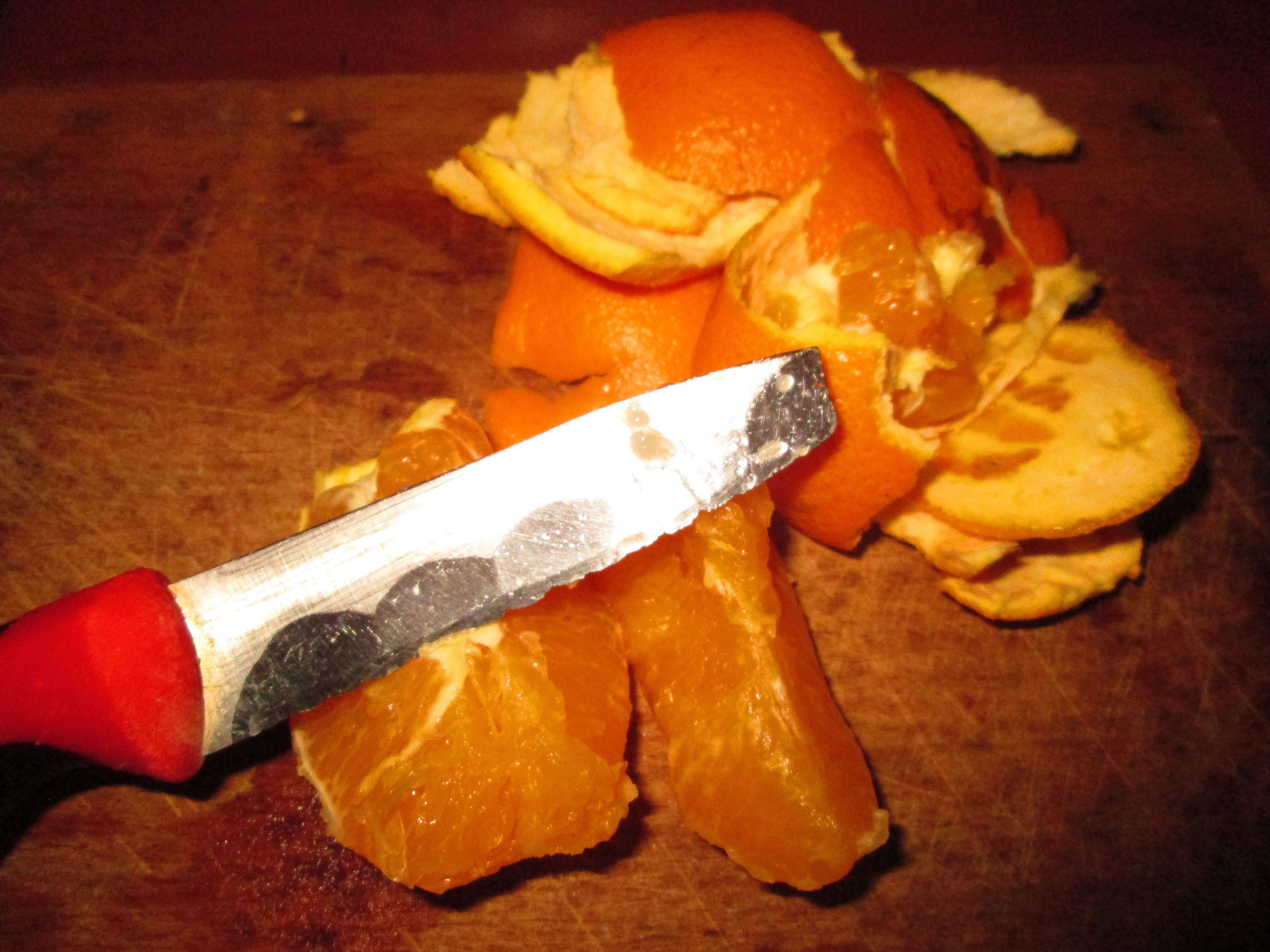 First I cut the orange, sometimes into larger pieces and sometimes into smaller pieces. This time I cut it into larger pieces. She first cuts the orange because her pieces are bigger than a banana.