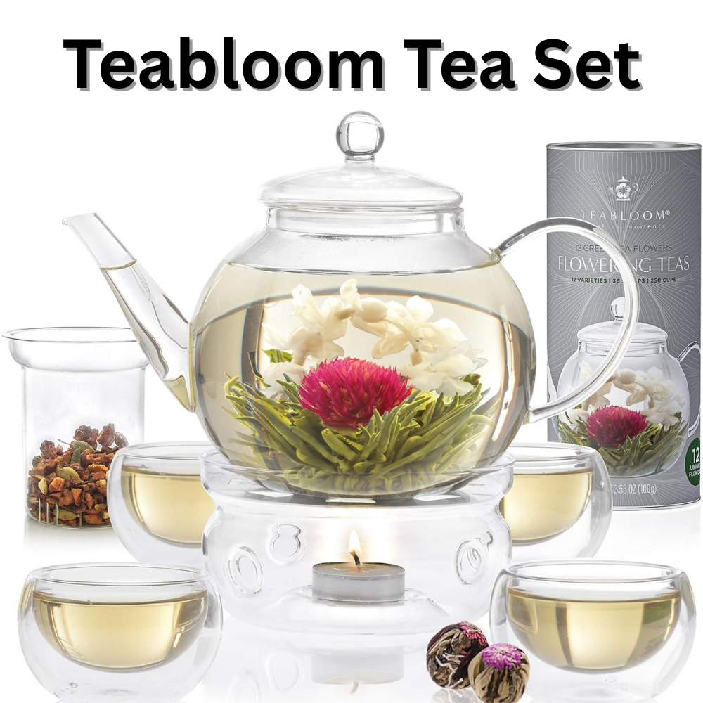 Teabloom Complete Glass Tea Set – Teapot (40 oz), Loose Tea Infuser, 4 Insulated Teacups, Tea Warmer with Candlelight, and 12 Flowering Teas – Elegant Blooming Tea Gift Set