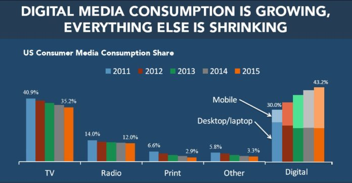 The consumption and use of digital media and marketing have experienced massive growth over the past five years resulting in the plummet of everything else. In the US, people are gradually beginning to shift from the use of Tv, Print, Radio and other forms of media to their phones and laptop with social media platforms and other websites.