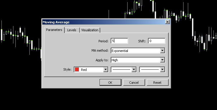 1-EMA with parameters 5 in period 0 in shift and apply to high.