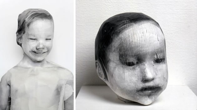 Midori Harima makes black and white Xerox copies of photographs on archival paper and uses these to create hollow papier-mâché sculptures, with methyl cellulose paste, archival tape and paperclay (clay that has paper fibres added to it, resulting in a stronger, light-weight modelling product that can make thinner more delicate forms and easily bonds with other mediums when dry). The final works are formed from tiny pieces of the images, exploring ideas about childhood senses and our fragmented absorption of data in an ‘information intensive society’.