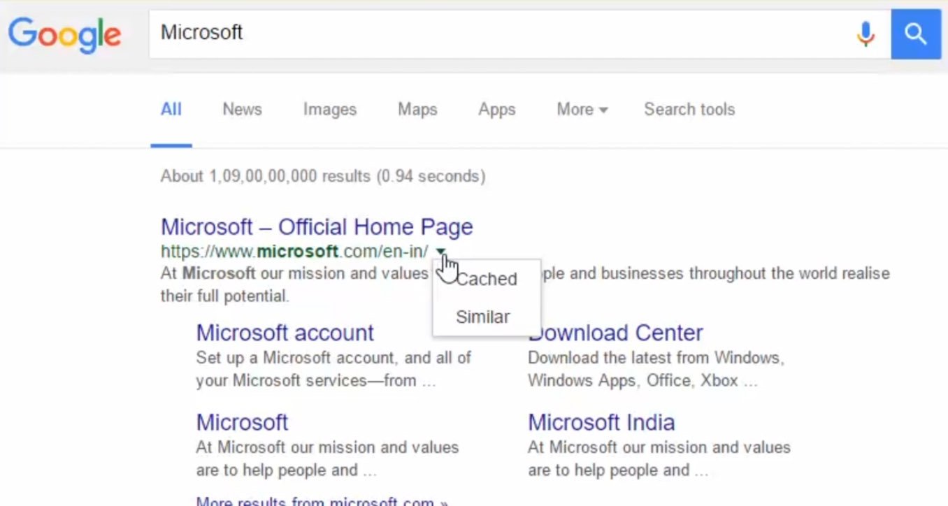 After entering a website from Google, you can go to its cached site if you have any problems later. The cached site means that the site is temporarily downloaded on your PC during a visit to any site. For example, Microsoft has reduced you to Google search results. Now to visit its cash site, click on the bottom right-hand side of the Google search result and click on the Cached button.