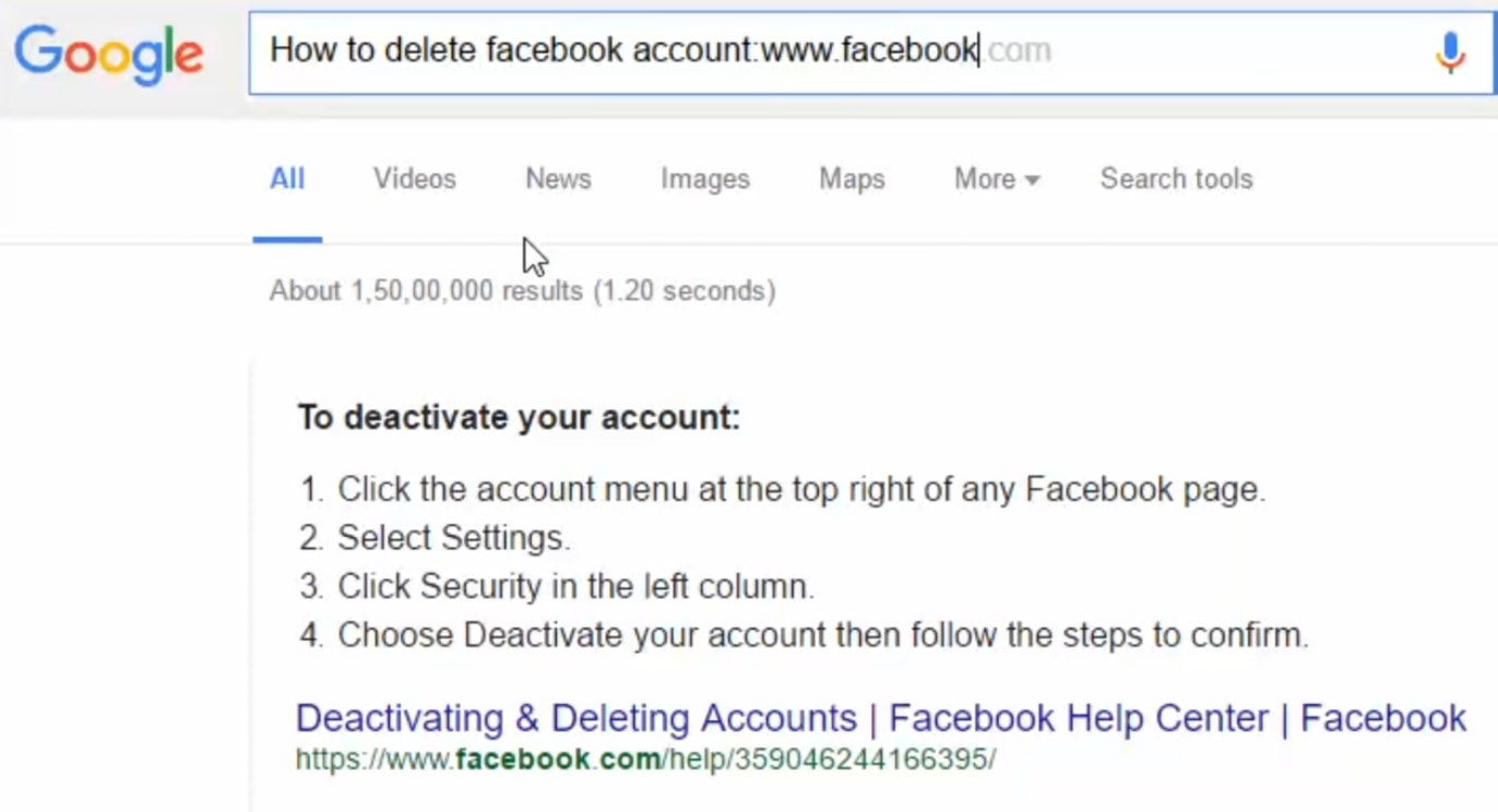 If you want to get a search result from a particular website, write the search item in Google and enter the web site and enter the search after typing the name of the website. Like how to delete facebook account: www.facebook.com