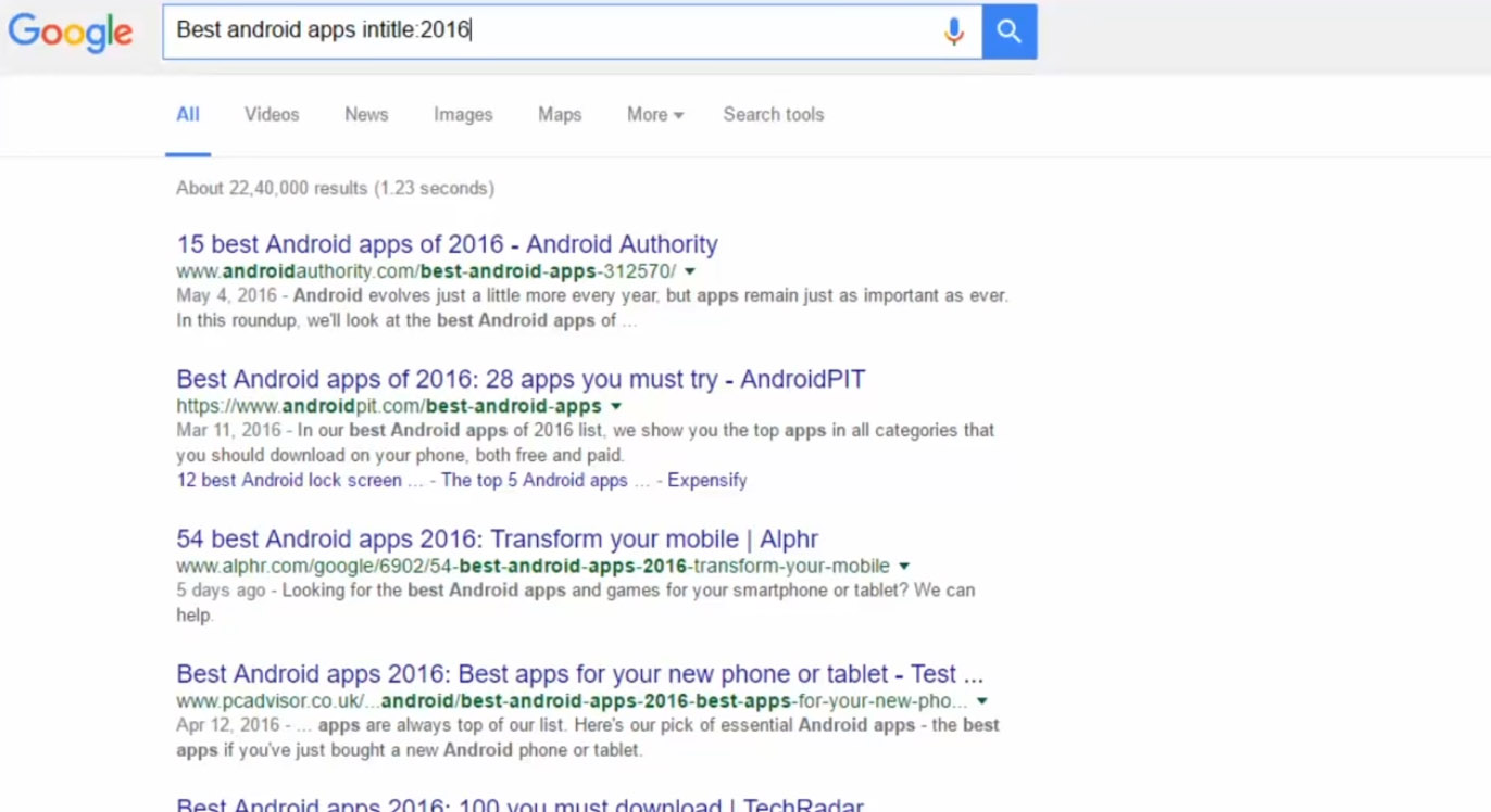 If you want to get a search result for a particular keyword title, you have to type it in another Google box. For example, the best Android Apps list of the year 2007. Then enter the box best android apps intitle: 2016 Enter as