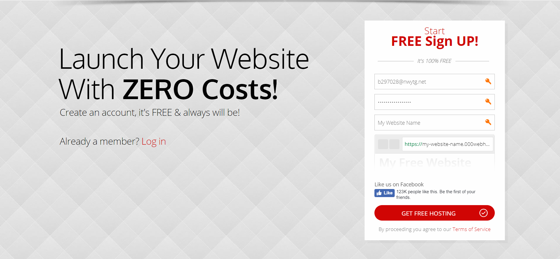 Now, fill in your email, password and your website name and then click "Get Free Hosting". You can also use temporary email services such as https://10minutemail.com if you are uncomfortable using your real information.
