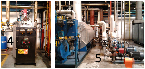 La imagen numero 1 y 2 corresponden a las calderas de vapor, las cuales se encargan de elevan la temperatura del agua que tienen internamente hasta que la misma se evapora y se sigue calentando dependiendo de la presión que requiera nuestro proceso, por lo general para la producción de materiales plastificados (plásticos flexibles) se emplea vapor para calentar la materia prima e integrar los diversos componentes, la imagen numero 1 corresponde a una caldera de 500 Hp y la imagen numero 2 a una caldera de 200 Hp. La imagen numero 3 es un tanque de agua para el llenado de las calderas y al cual se le agregan ciertos químicos para garantizar que el agua no sea dura (mucho contenido de algunos minerales) esto permite que la caldera no sufra daños internamente.