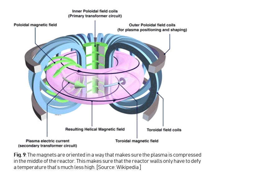 Because the gas is now ionized, it reacts to magnetic fields, and that’s how we can give the plasma a defined shape in order to control it. The magnetic fields will be oriented in such a way that the plasma won’t get near the reactor walls (Figure 9). This is essential, as there’s no material known to man that can resist the extreme temperatures of a plasma.