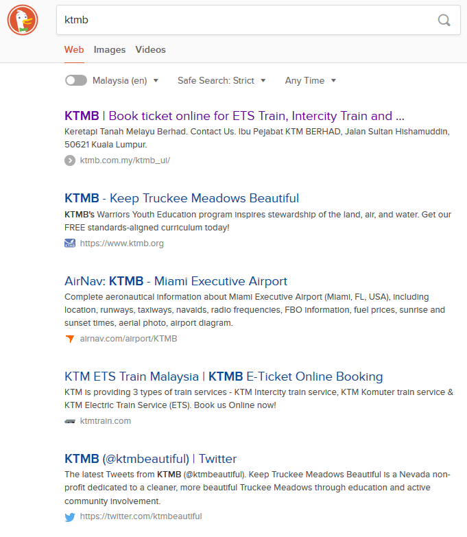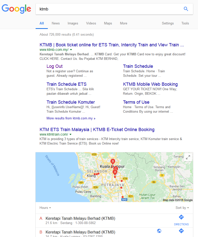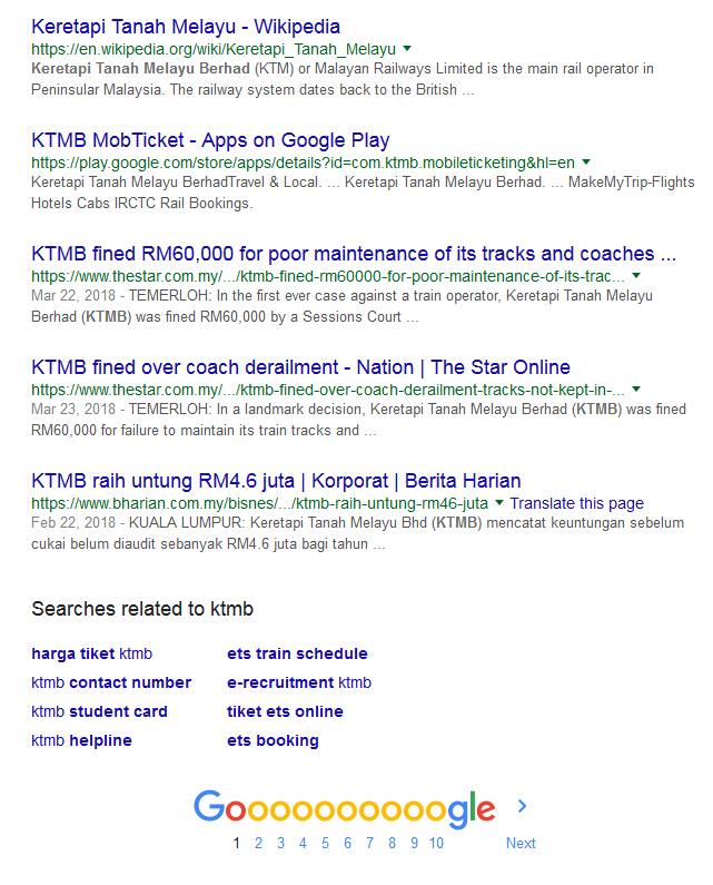 It is said that search bubbles restrict people from knowing more than what search engines think they should know - since they bubbled it - I didn't believe that a long time ago. But right now...wow. I searched for the Malaysia's railway systems website to print a ticket I will be using tomorrow, and this is what shows up.
