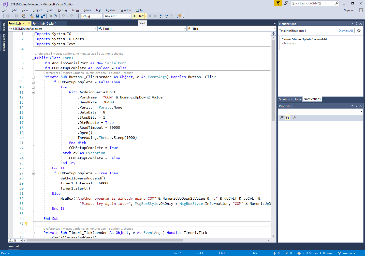 Then, download the source code from the GitHub Repo above and double-click the STEEMDuinoFollowers.sln file:
