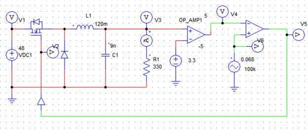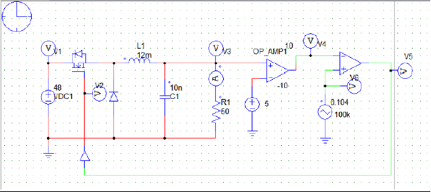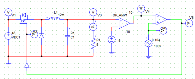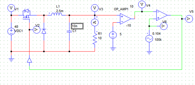 V4 = G * (Vo-Vref), where G is the amplification of the error obtained at the output. The triangular source value will have the switching frequency (100Khz) and the duty cycle value k (0.5).