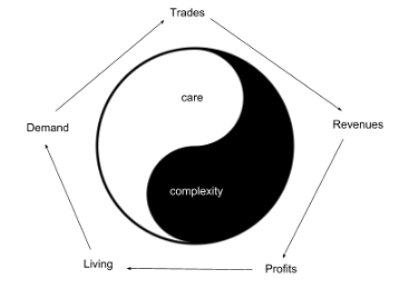 The inherently complex nature of trading introduces risks, errors, and unpredictability. Thus, the need for care and conscious human interaction is always constant in any governance system. This creates a yan-yang kind of situation where the complexity of system dynamics drives the need for human care and profits.