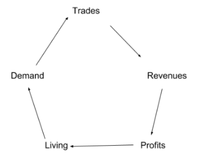 With the exception of big players and early adopters (hodl), entities must be constantly trading to survive inside any socioeconomic system. Trades generate revenues, that generate profits, that generate living, that generates demands, which closes the loop generating new trades.
