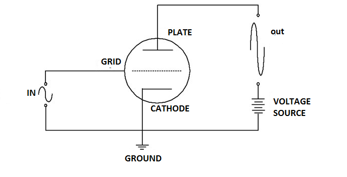 When the signal level on the grid undergoes even minimal changes, there are similar but much greater variations between the cathode and the plate. This, as can be seen in the next scheme, results in signal amplification.