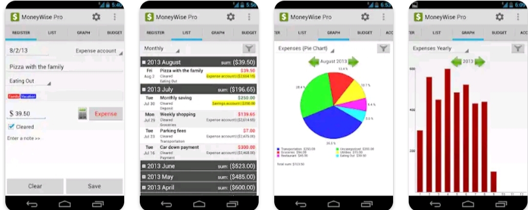 Have used the pro version of this app for at least two years or more. My favorite function is the pie graph view of expenses. At a quick glance I can see what is eating up my money the most at all times. I also love the ability this app has to total all of my accounts to a single worth. I use this app consistently in line with my bank's app to stay on top of my cash flow. A lot of complexity is built into a simple to understand UI and is a pleasure to use. A first install with all my new phones.