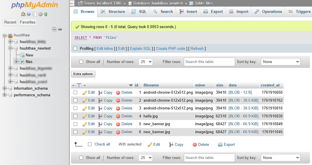 mysqli_stmt_bind_param($stmt, "ssisi", $safeName, $cleanMime, $size, $payload, $created);