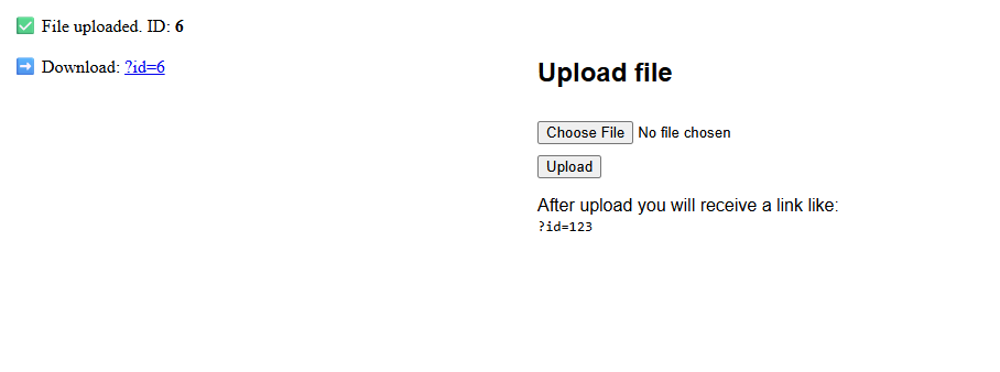 <p>After upload you will receive a link like:<br><code>?id=123</code></p>